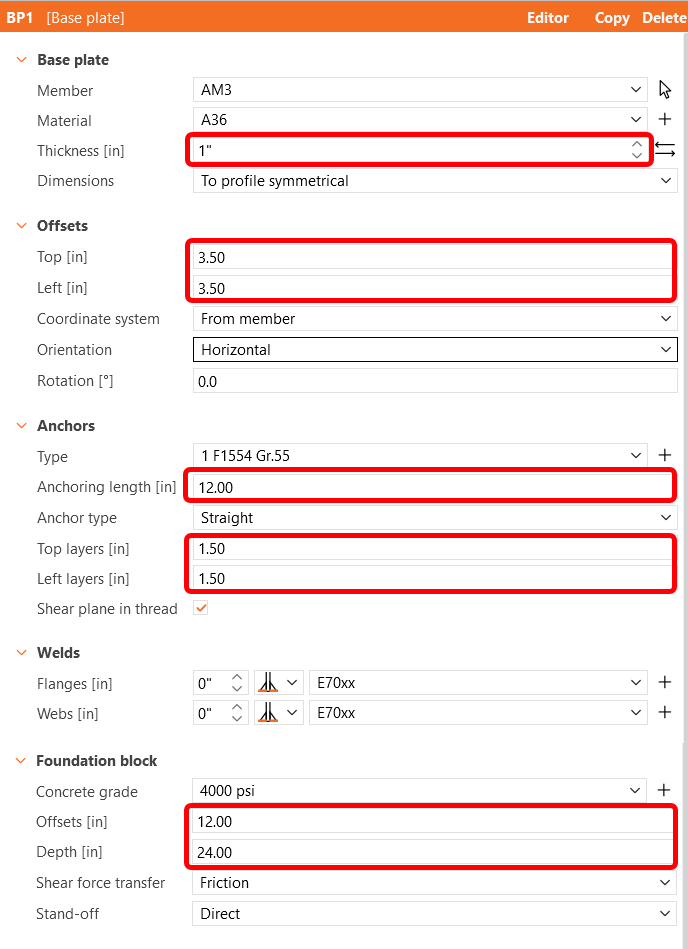 Select weld type E70xx, steel A36, concrete 4000psi and bolt assembly 1" F1554 Gr 55.