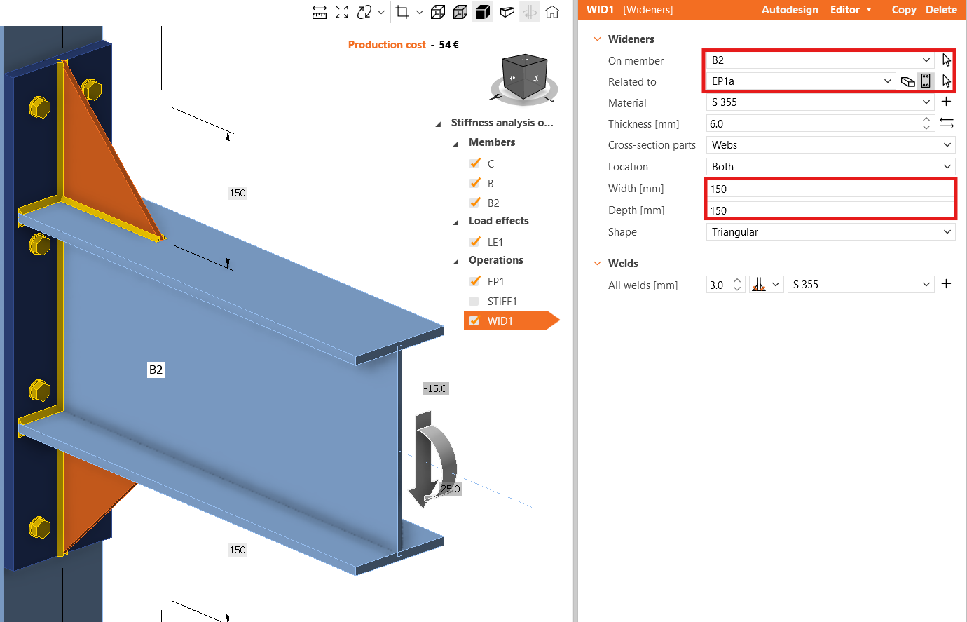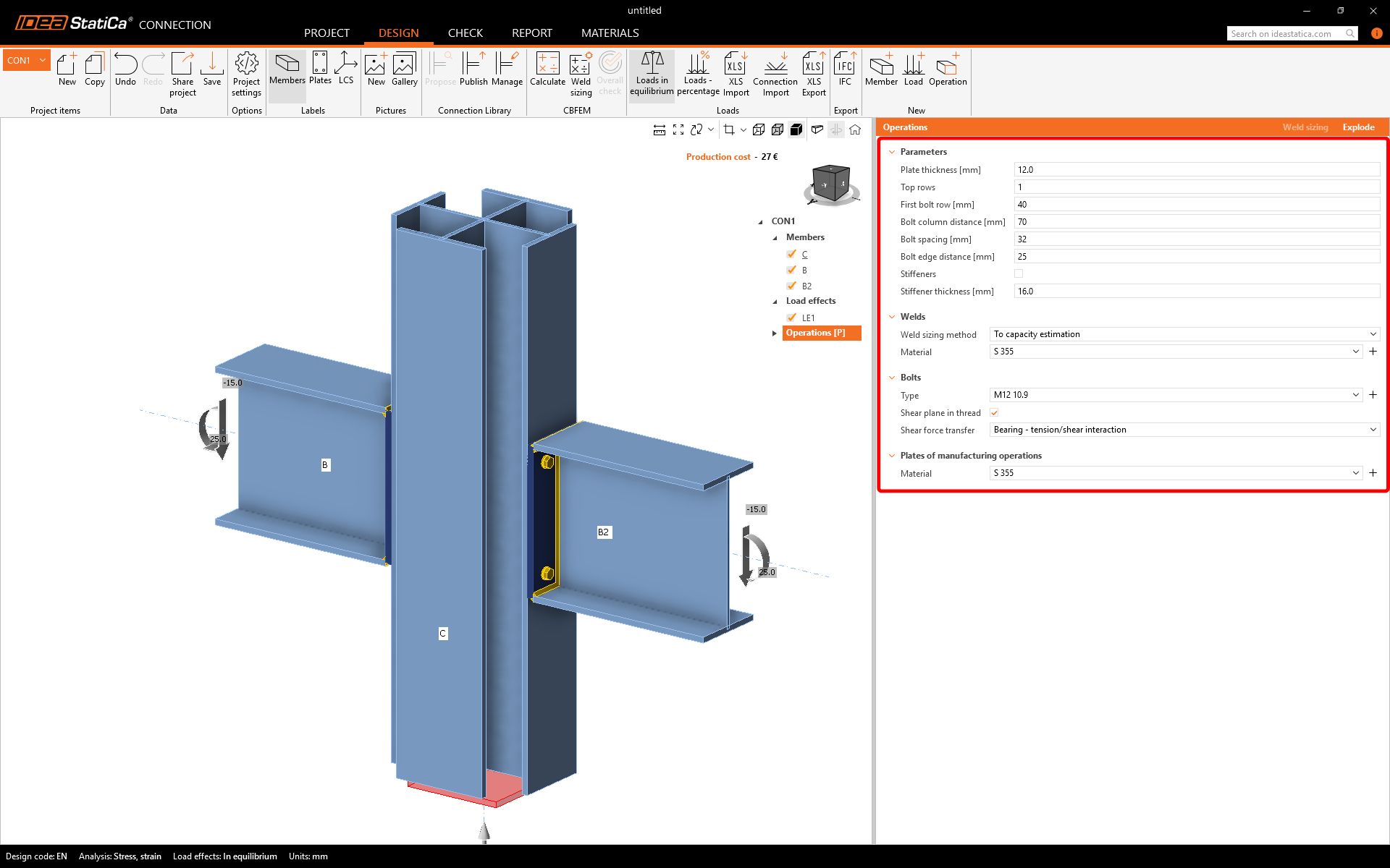 Make sure that the stiffener operation is deactivated, and adjust thickness, dimensions and position of bolts of the end plate EP1.