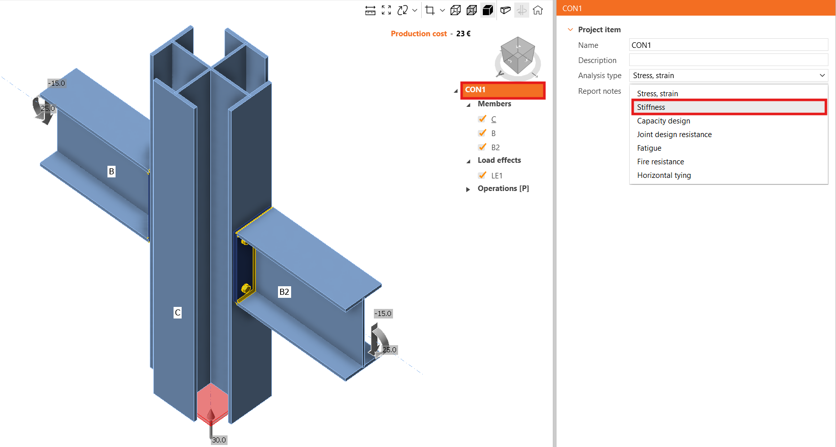 Select the project item CON1 and switch the analysis type to Stiffness analysis (ST).