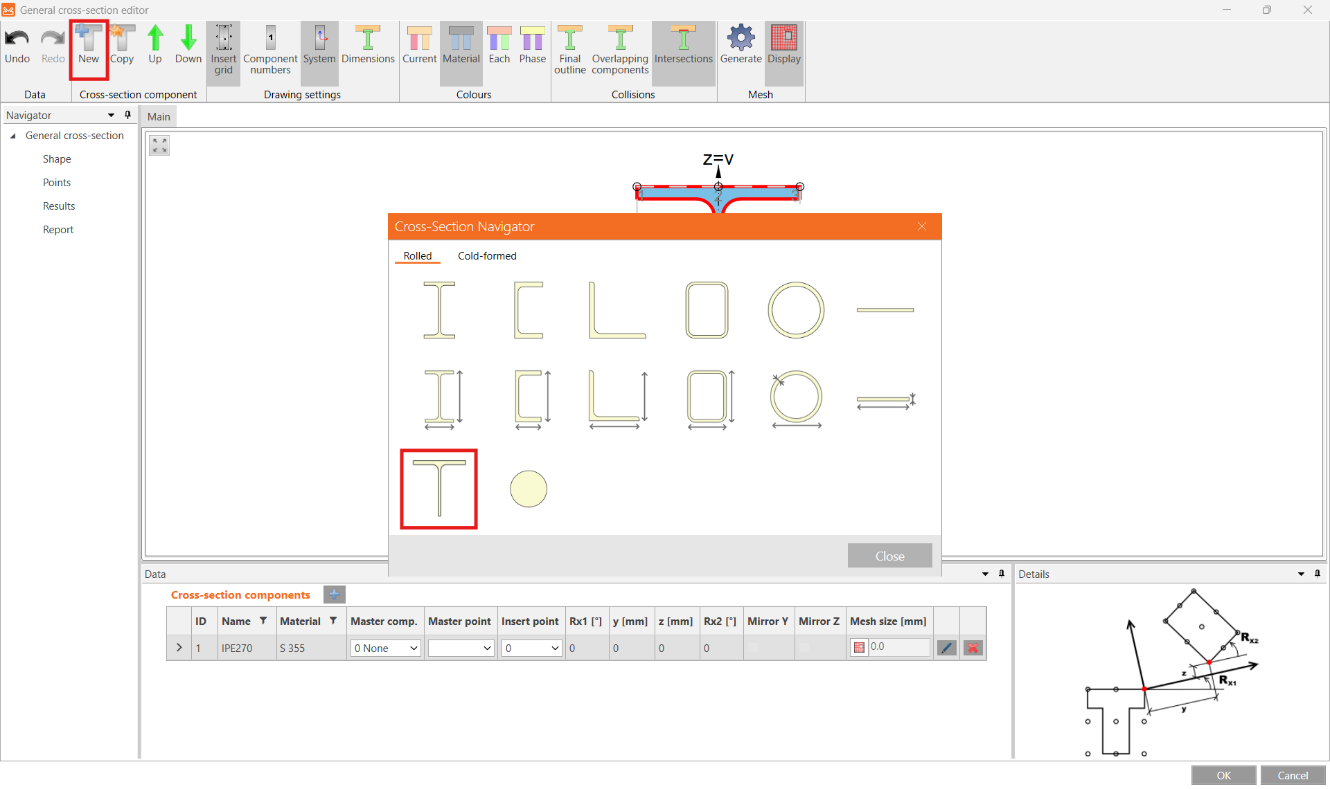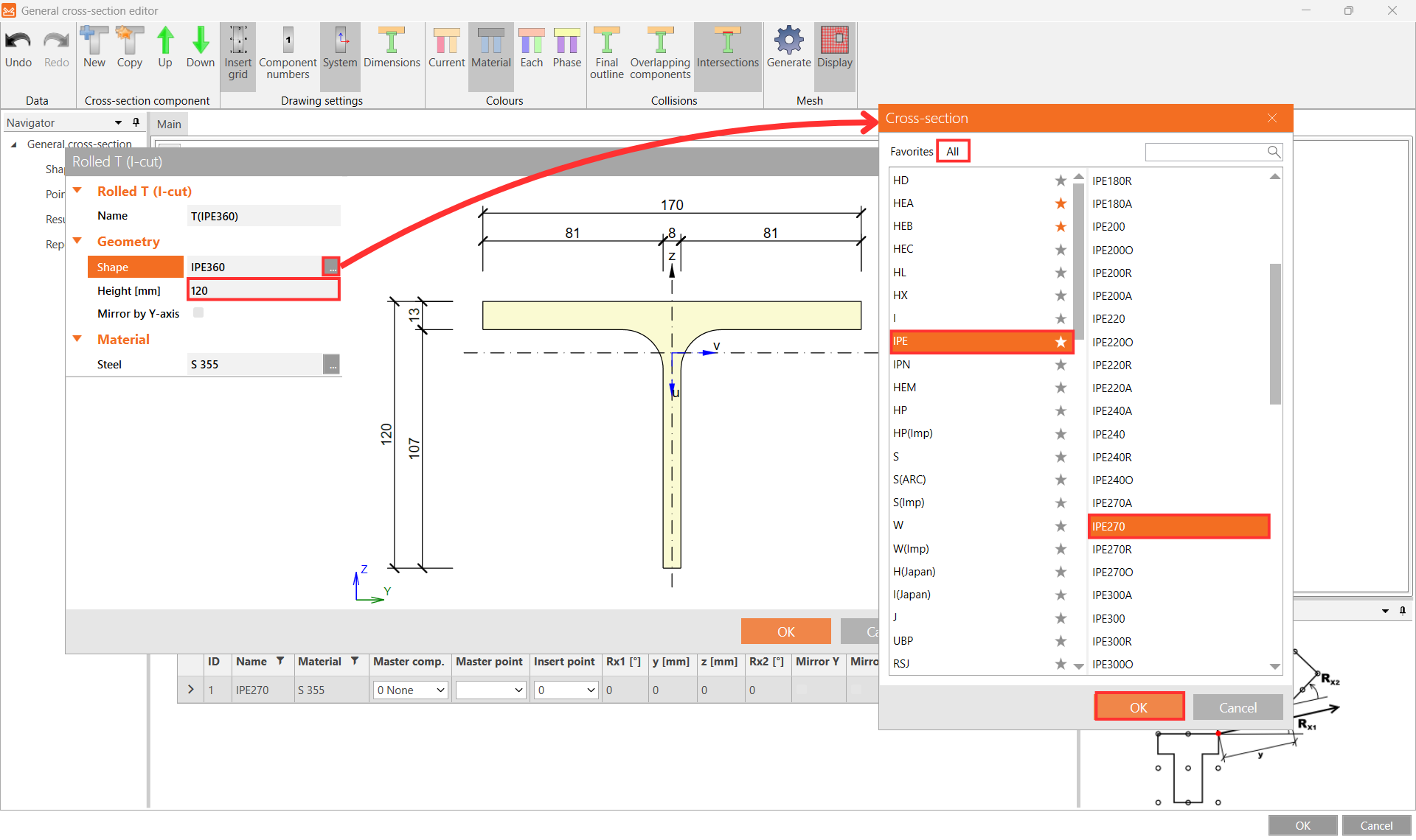 For the Shape select IPE270 from the cross-section library and input 120 mm for the Height and confirm OK.