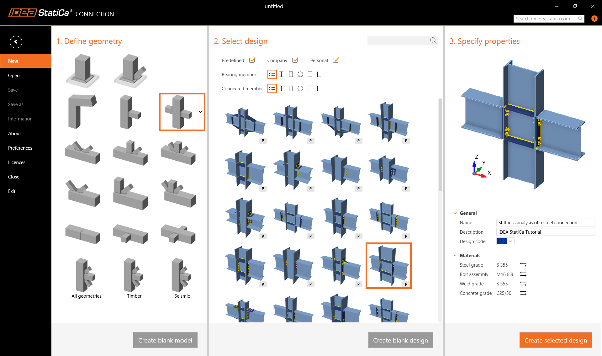 Create a new project by selecting the starting template from wizard closest to the desired design. Fill in the name, select the steel grade S355, design code Eurocode, and Create project.