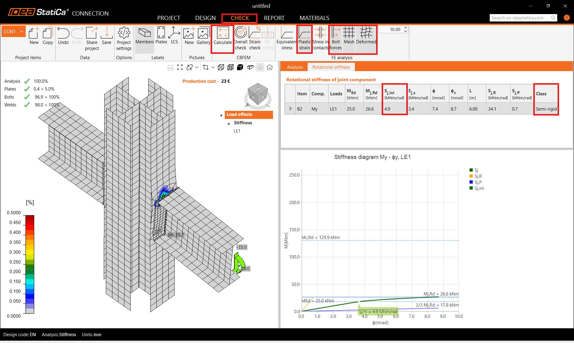 Go to the tab Check and turn on the Plastic strain, Bolt forces, Mesh and Deformed to see the behavior of the connection. In the tab Rotational stiffness we can read the class as Semi-rigid and the value of the Initial rotational stiffness Sj,ini.