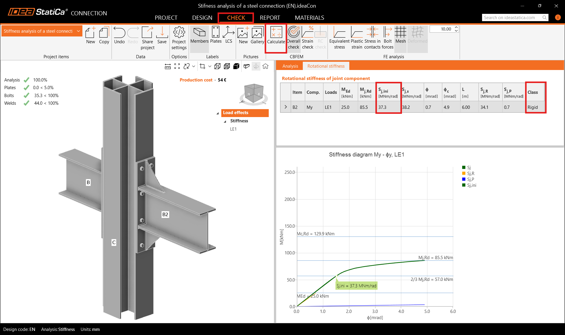 Calculate the stiffness analysis again, and in the Check tab see the class became Rigid and the higher value of the Initial rotational stiffness Sj,ini.