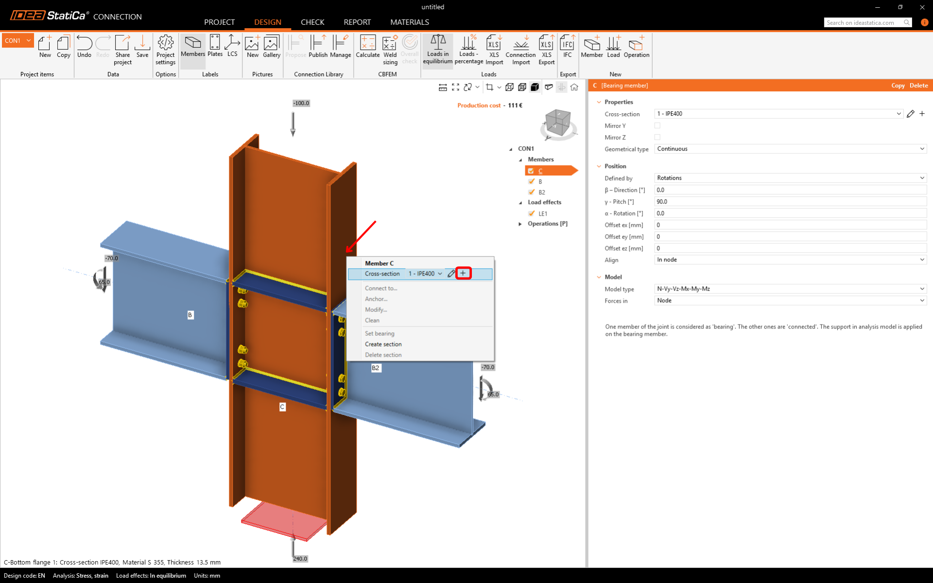 Right-click on the vertical member C and open the context menu with available actions. Use the Plus button to add a new cross-section.