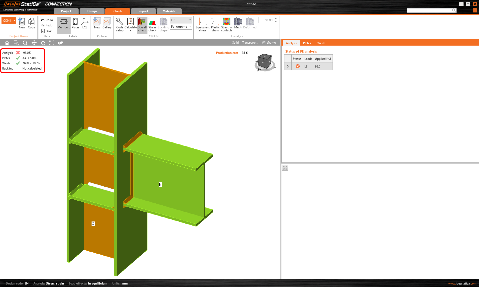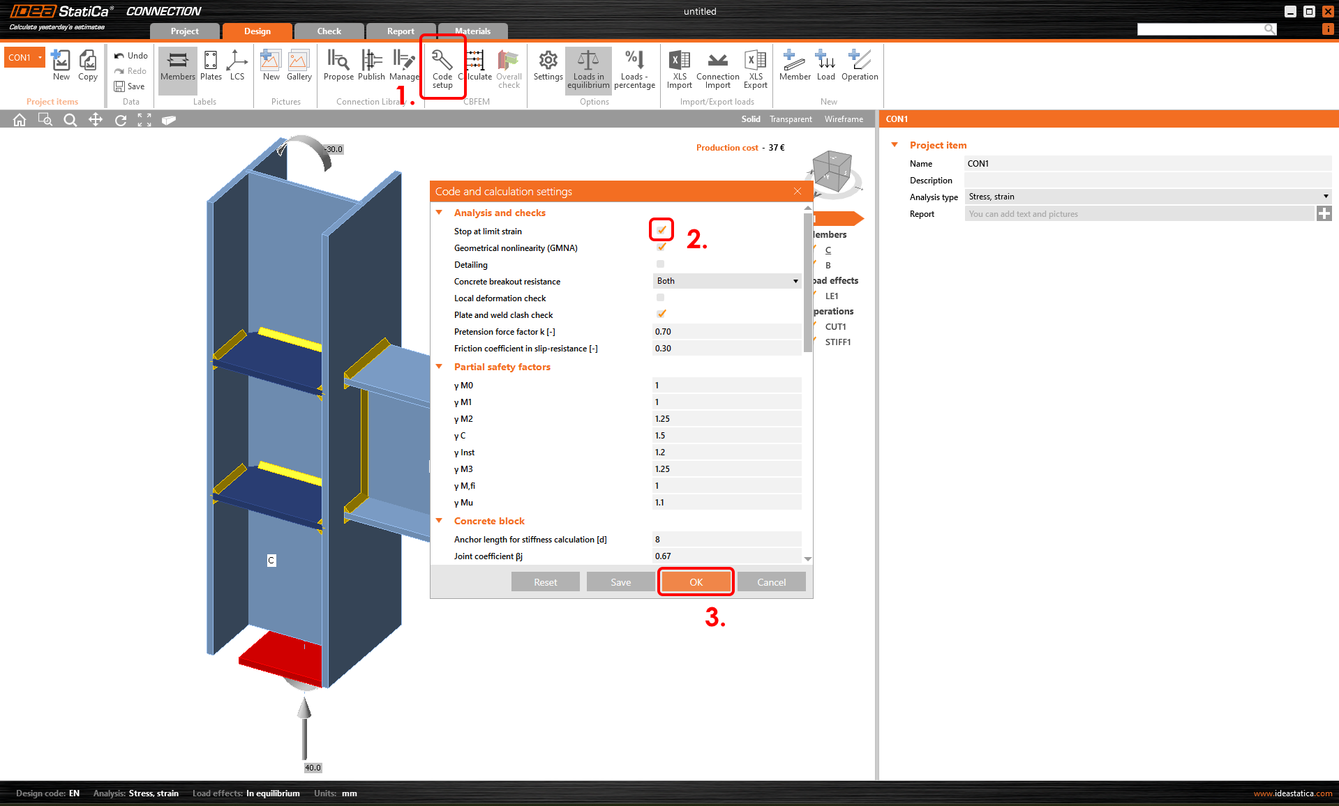 It can happen that sometimes the connection is overloaded, exceeding the limit value of plastic strain. And in some such cases, it's not efficient to let the software continue with the calculation to apply 100% of the load. For these occasions, we have the Stop at limit strain functionality.