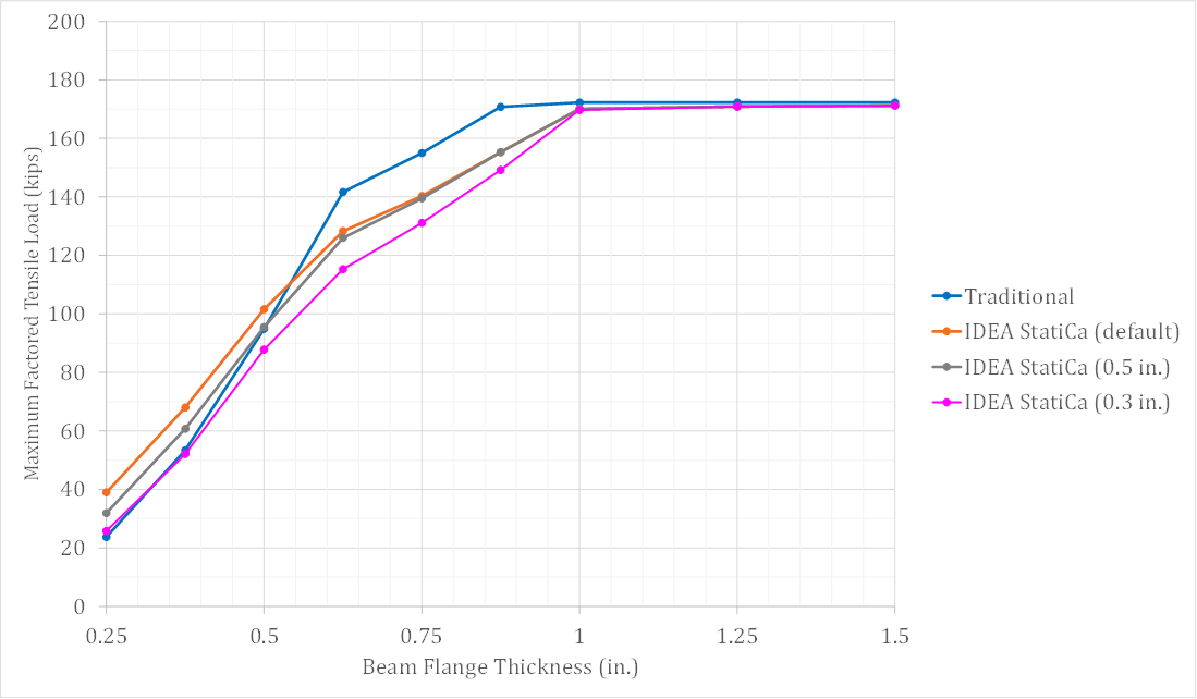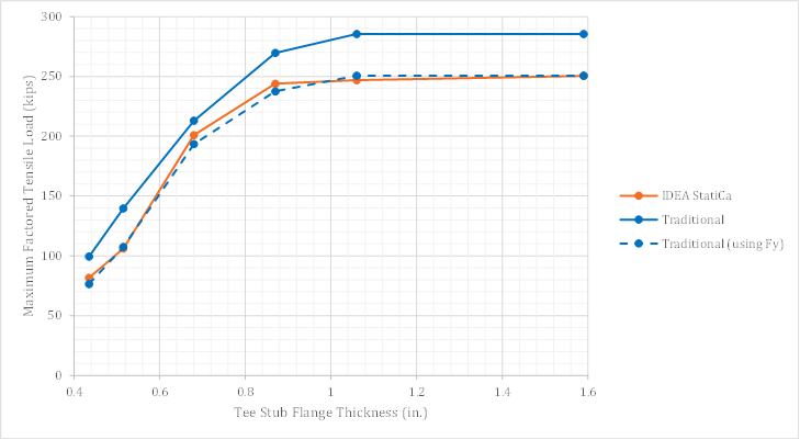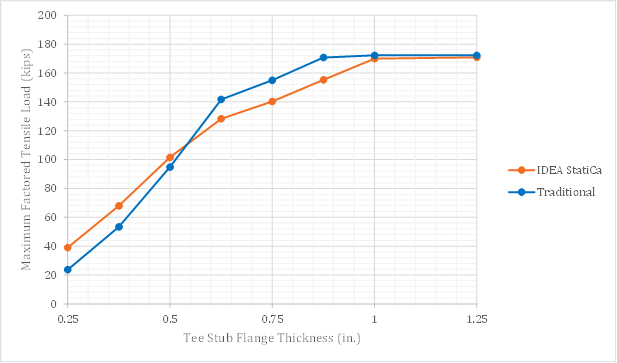 Calculations were performed for eight T-stub flange thicknesses between 0.25 in. and 1.25 in. The maximum factored tensile load which could be applied to the connection is presented in Fig. 4. As expected, for both the traditional calculation results and the IDEA StatiCa results, the maximum factored tensile load increases with T-stub flange thickness until a plateau is reached where prying action is prevented. At the plateau, the strength of the connection is governed by the provisions of Section J3.7 of the AISC Specification (2016) and results from the traditional calculations and IDEA StatiCa match. Where prying action impacts the strength of the connection, there are differences between the traditional calculations which follow the guidance of Part 9 of the AISC Manual (2017) and IDEA StatiCa which explicitly models the connection using the CBFEM.
