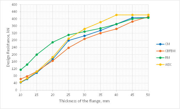 The discrepancy between results from traditional calculations and IDEA StatiCa for prying action of thinner plates has been observed and investigated previously. Wald et al. (2020) compared traditional calculations to results of the component-based finite element method and to results from a research finite element model. The results showed that while the component-based finite element method does result in greater strength than the traditional calculations for thinner plates, there remains a significant margin of safety when compared to the research model. The study by Wald et al. (2020) was expanded in this work by adding a comparison to the strength computed using the equations for prying action presented in Part 9 of the AISC Manual (2017). Results, which are superimposed on existing results from Fig. 5.1.5 from Wald et al. (2020), are presented in Fig. 6. For thinner plates, the AISC results are close to that of the component method (CM).