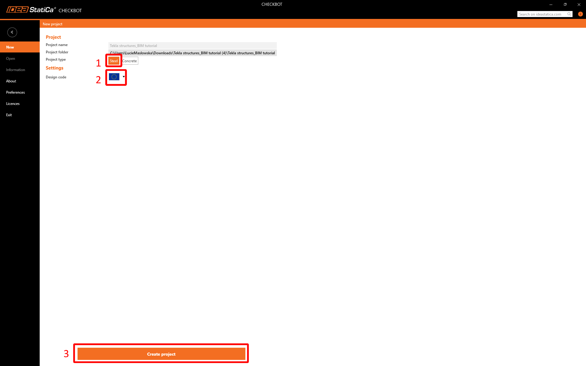 Select the New option with project type Steel and design code EN. Then select Create project.