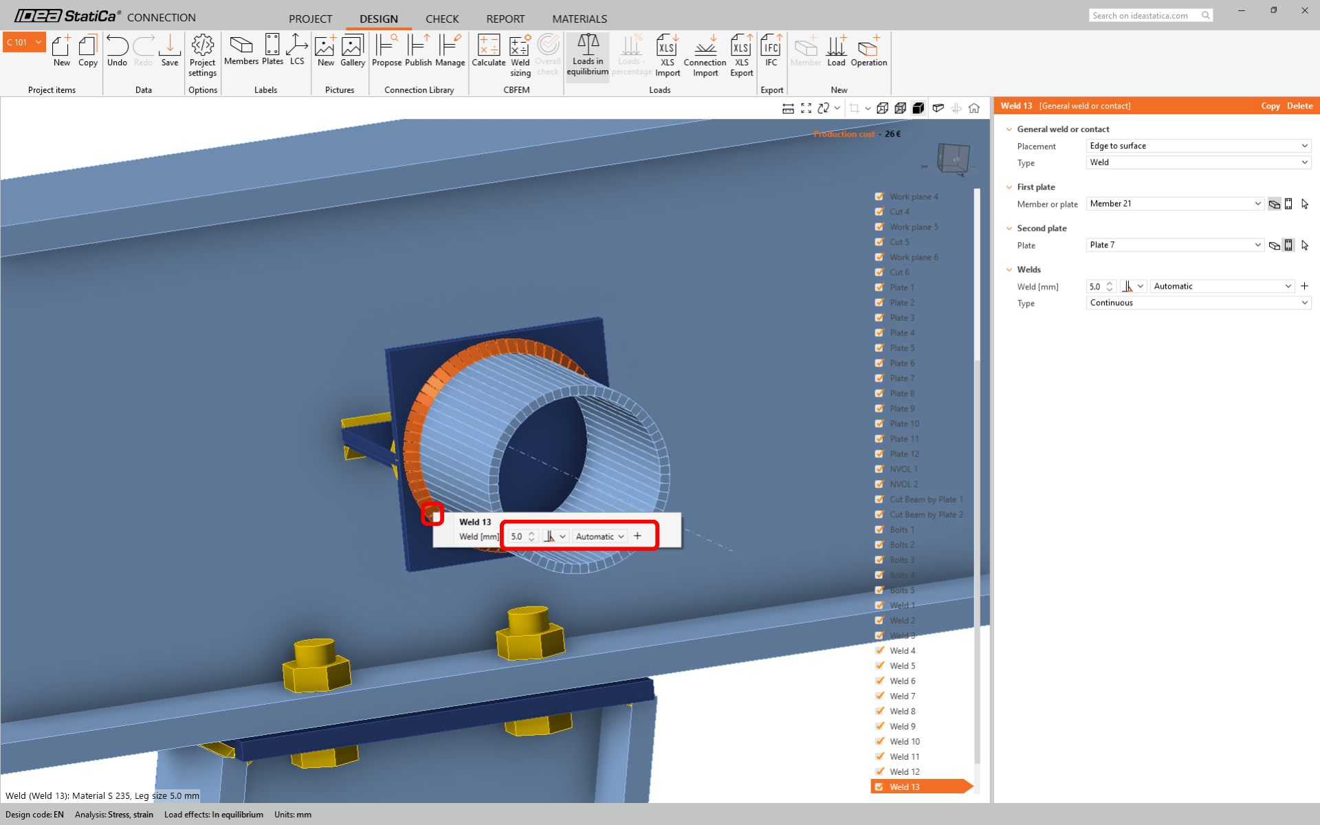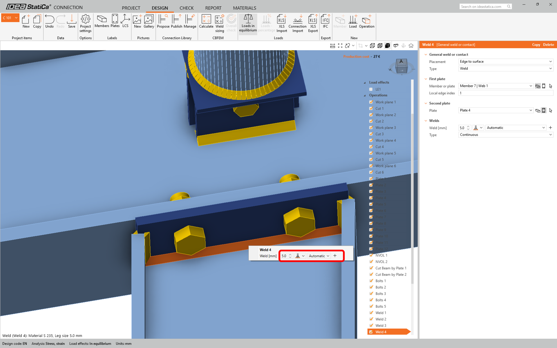 For member Strut S1-1 change the size of the weld to 5 mm and the rear side orientation.