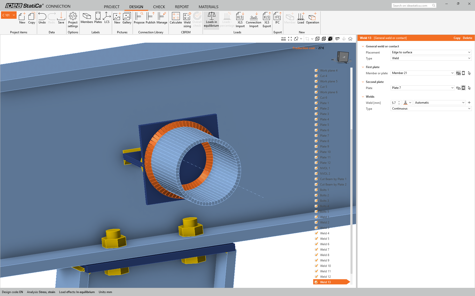 • Then select all the connection components (bolts, welds, plates, etc.) by dragging the mouse from the right-top to the left-bottom corner and confirm with the spacebar.