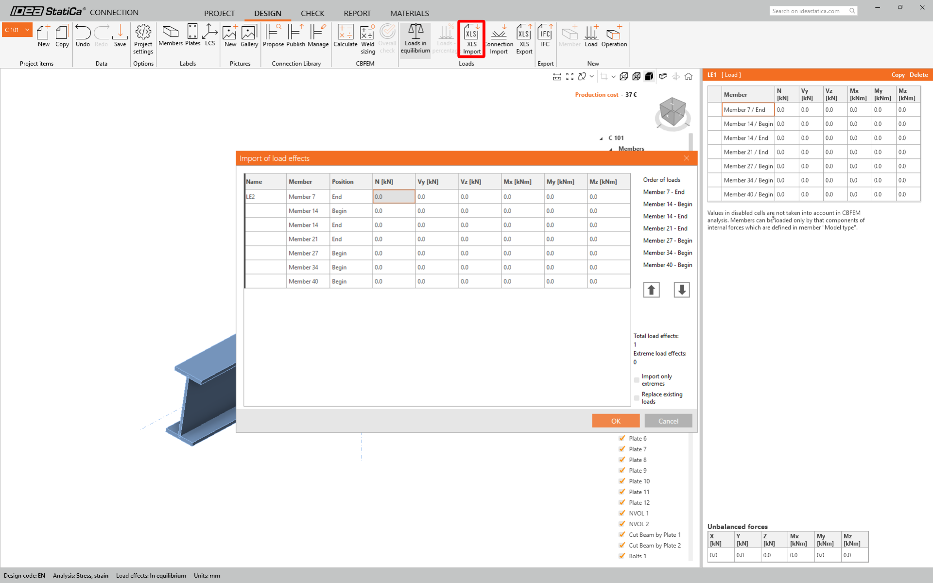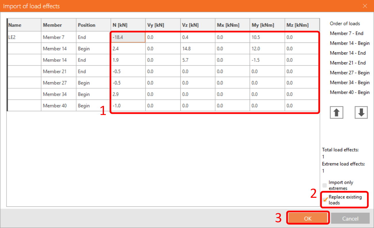Please be aware you need to have the same order of rows and columns in the Excel table as in the Load effects table in the IDEA StatiCa Connection application. If the rows or columns are switched, you will get the incorrect input of internal forces on members.
