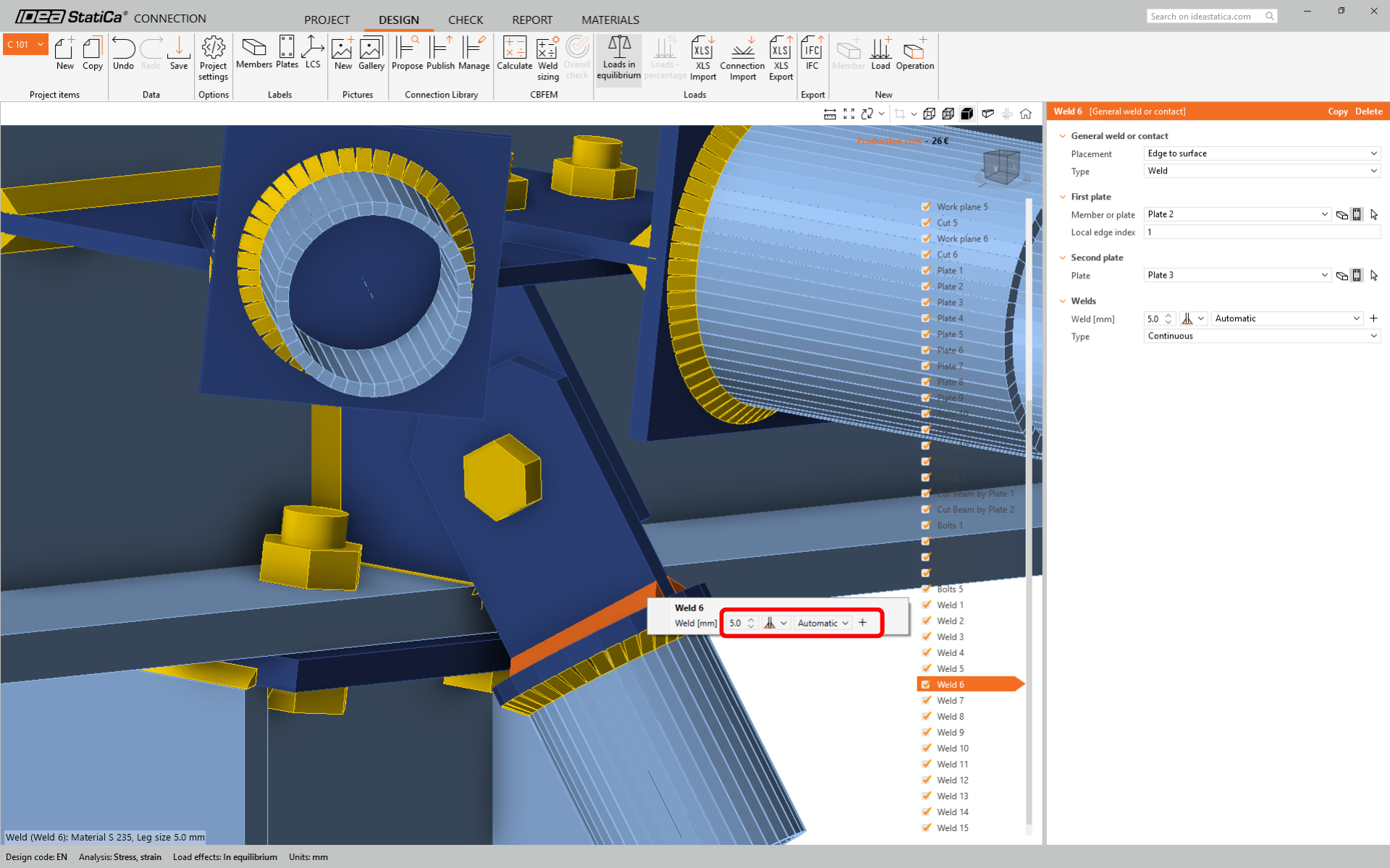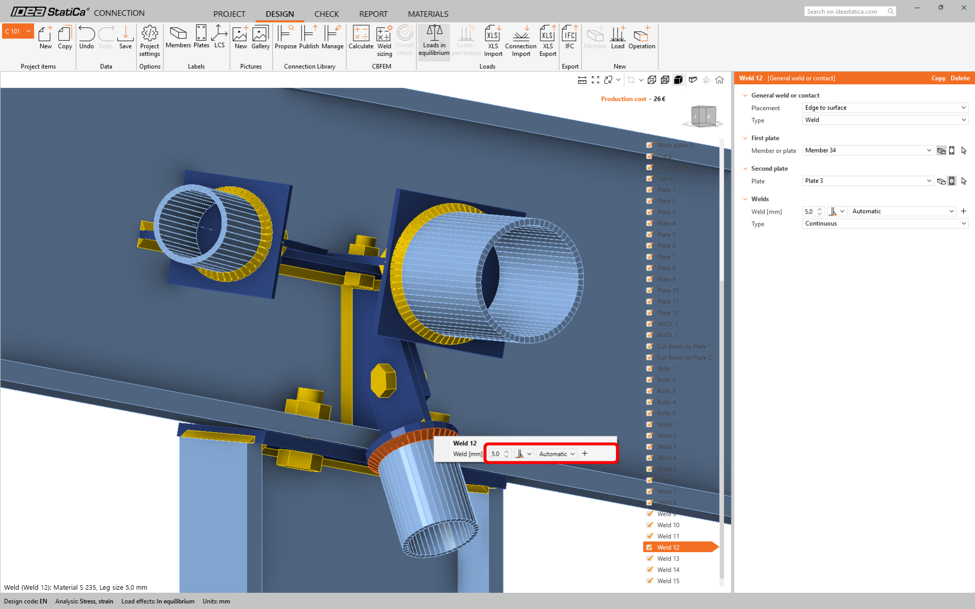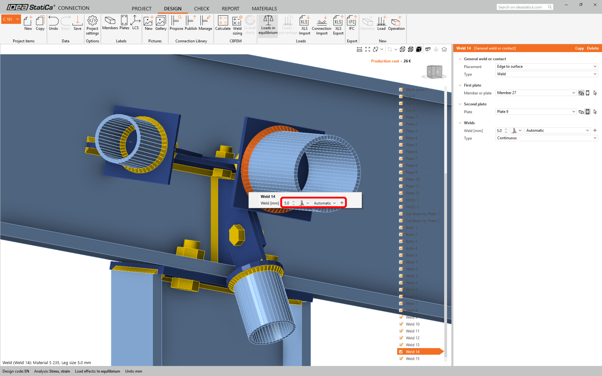 For member Diag 3-3 change the size of the weld to 5 mm and the rear side orientation.