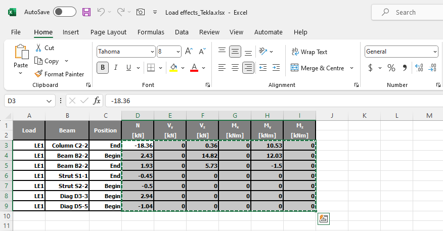 Download the attached Excel sheet with load effects and open it. Select the values of the internal forces in the table and copy them (Ctrl + C).