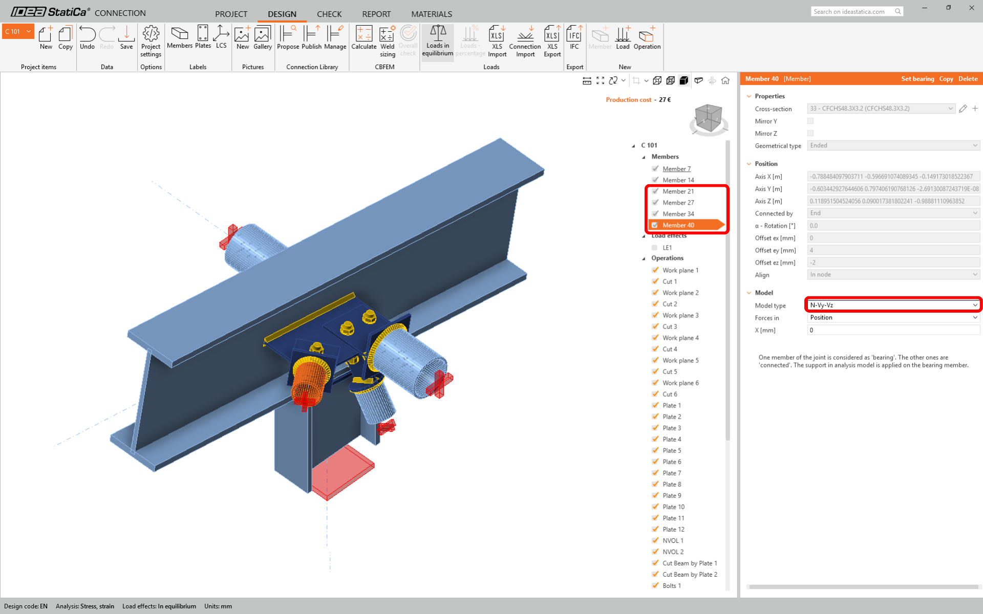 We are going to be using a single bolt connection for the spacing and diagonal bracing member. For this type of connection, we must also change the Model type of the brace member to N-Vy-Vz. Select the members in the list of Members: Strut S1-1, Strut S1-2, Diag D3-3, Diag D5-5, and modify the Model type in the drop-down list.