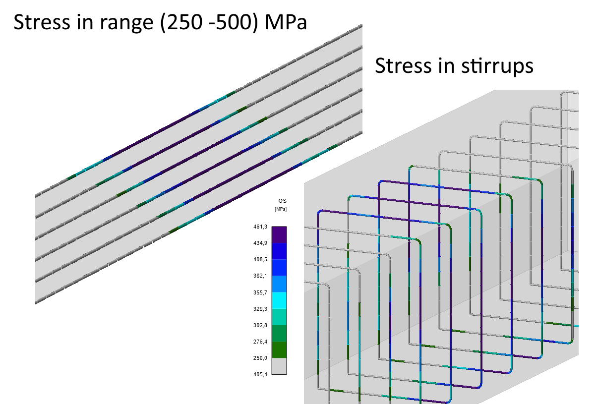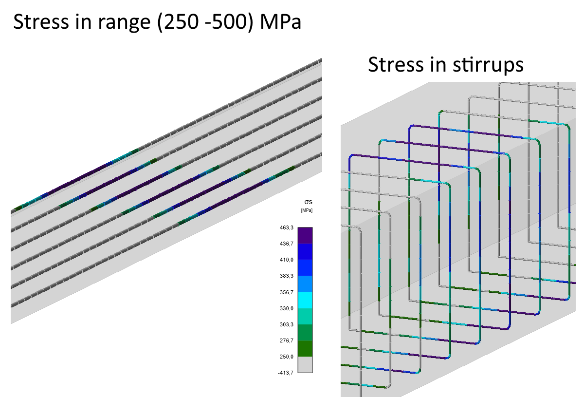 The maximum shear stress on the closed stirrups has reached a value of 460 MPa, which means that shear failure must also be taken into account