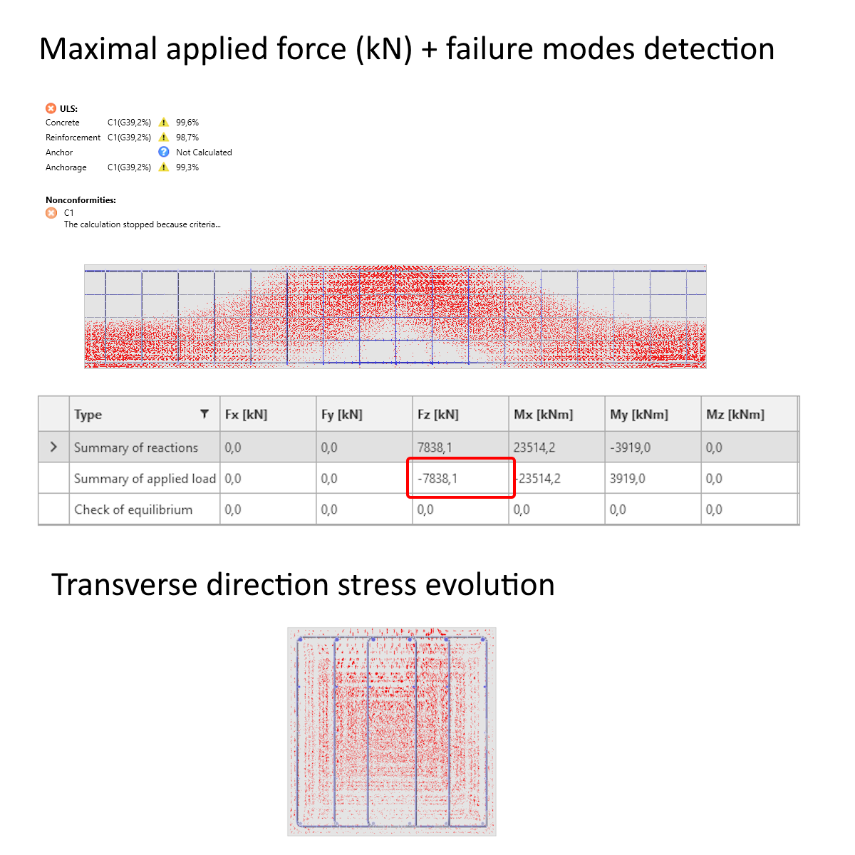 The force absorbed by the footing strip reached -7838 kN, which is approximately the same as bearing capacity in LSS. The failure mode involves concrete crushing, tensile rupture of the longitudinal reinforcement, and the horizontal legs of the stirrups in tension.