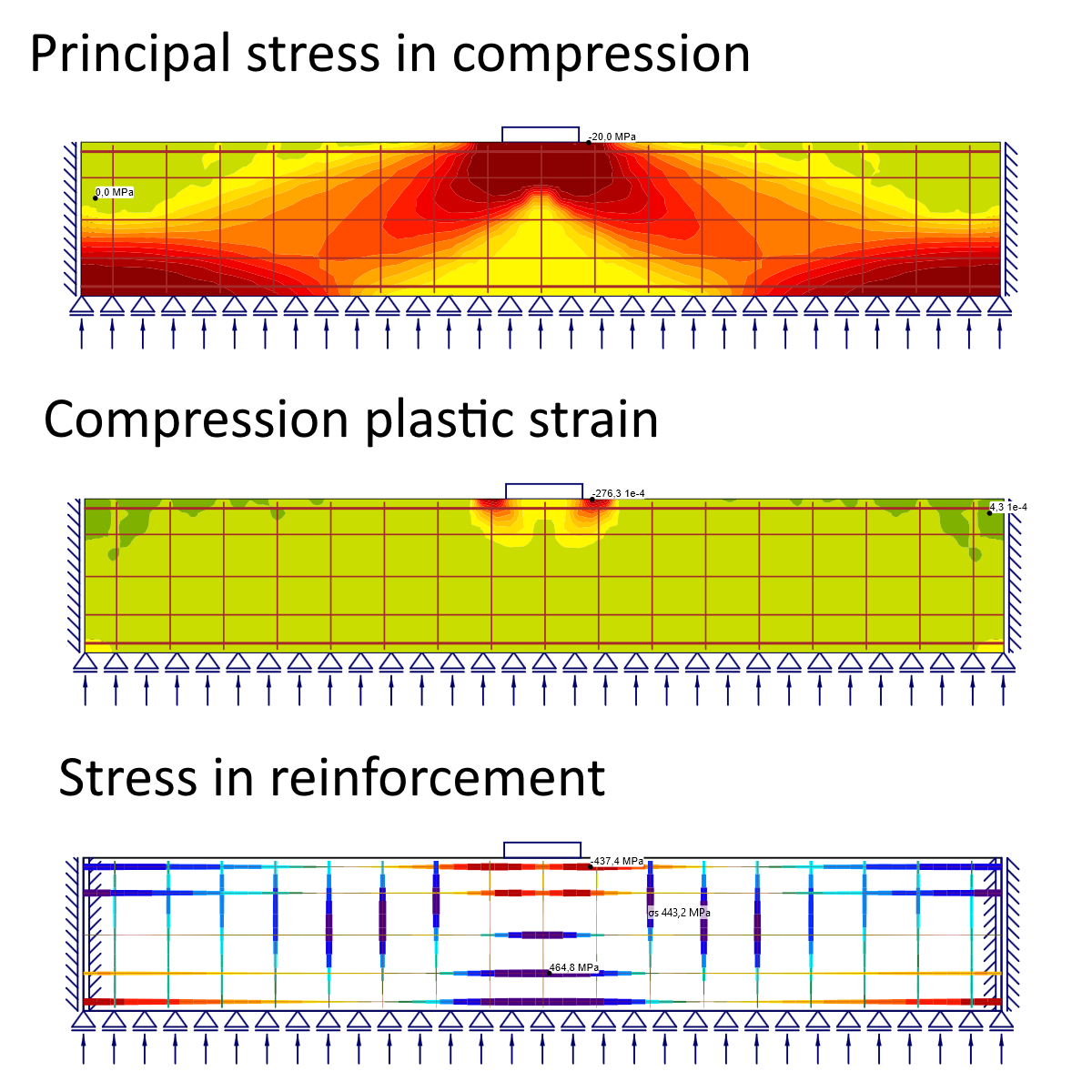 • Excellent for capturing global deformation shape, contact stress redistribution, and reinforcement involvement.