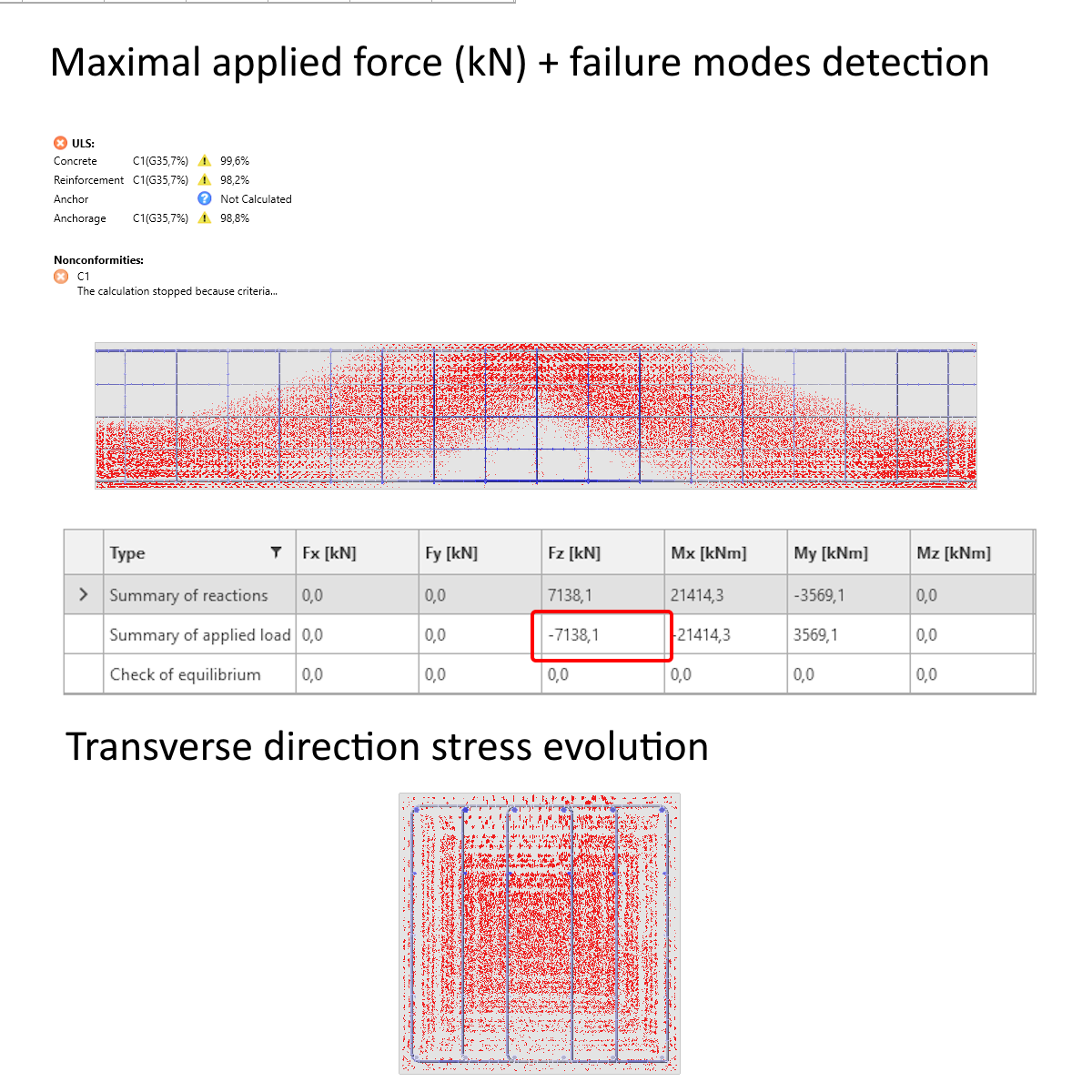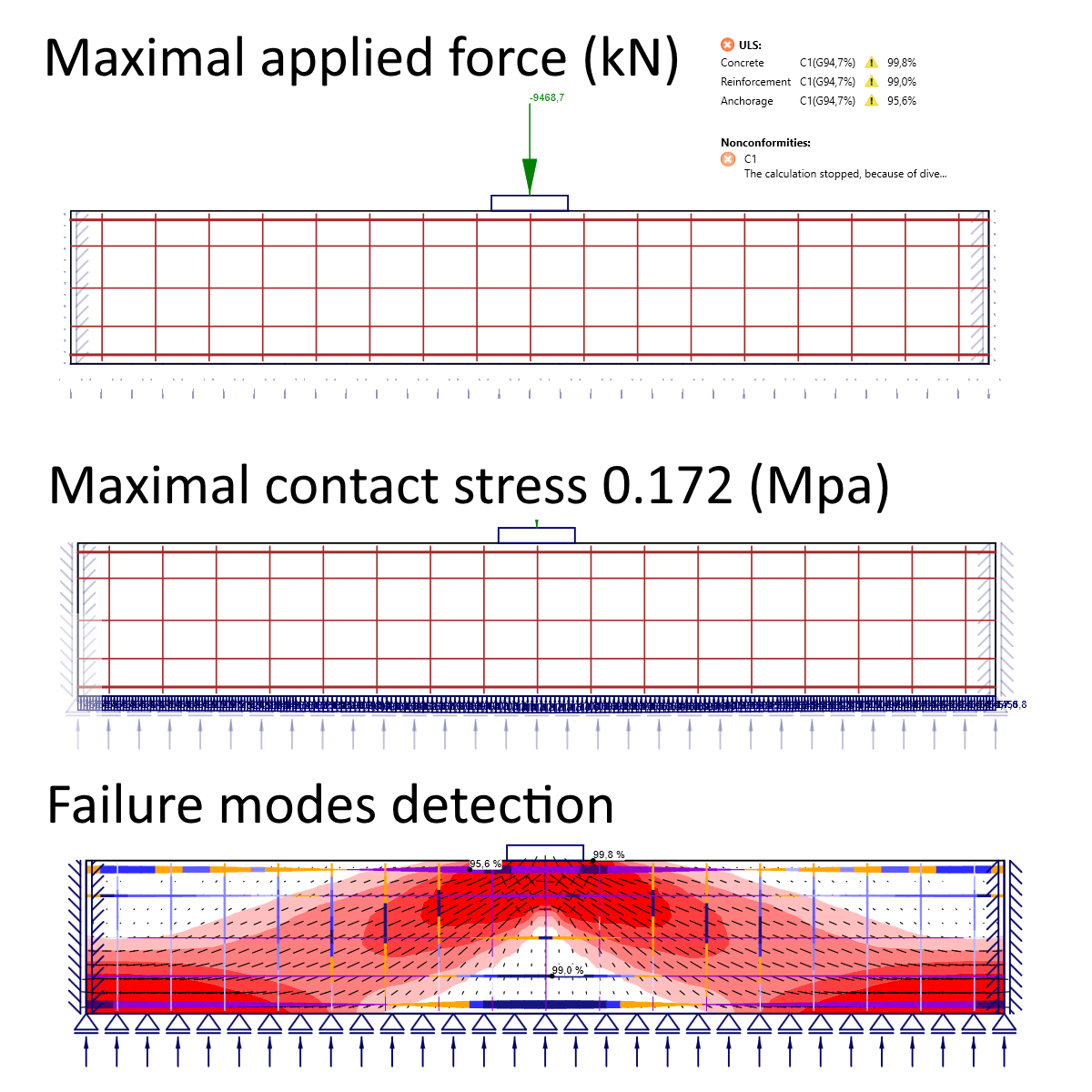 The maximum applied force capable of addressing the failure modes has reached -9469 kN. The vertical force has resulted in a contact stress of 0,172 MPa in the middle and 0.146 MPa at the ends. The displacement copies the shape of the stresses and reaches a maximum of 0,11 m.