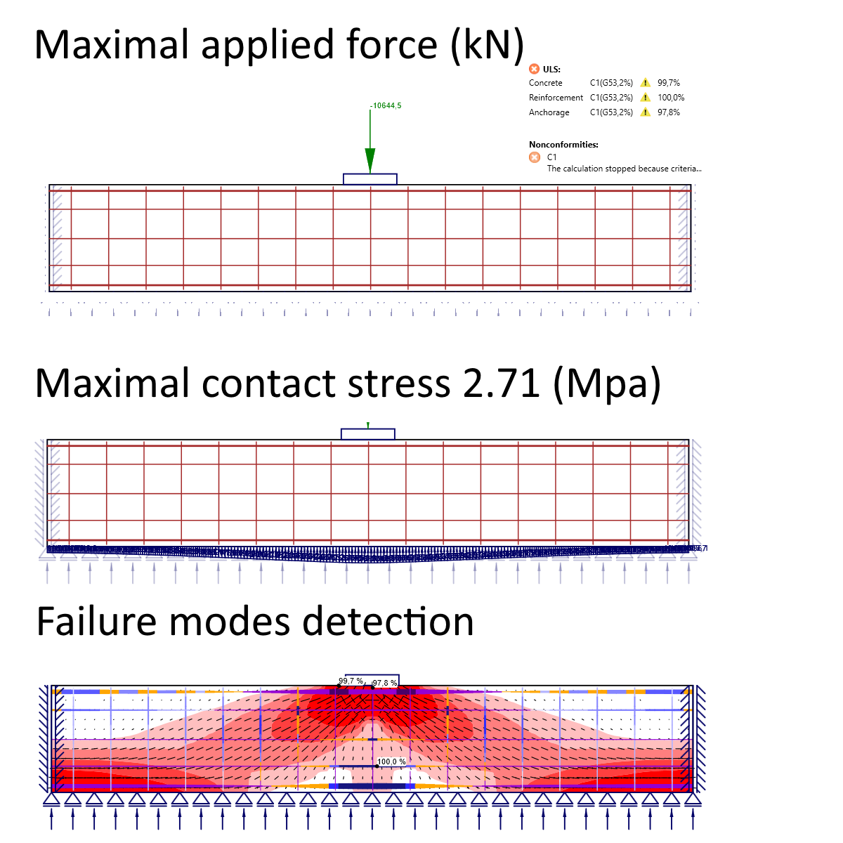 The maximum load at which all governing failure mechanisms can still be resisted is –10645 kN. The corresponding vertical reaction induces a contact stress of 2.71 MPa at the footing–soil interface in the middle and 0,996 MPa at the end. The displacement copies the shape of the stresses and reaches a maximum of 0,02 m.