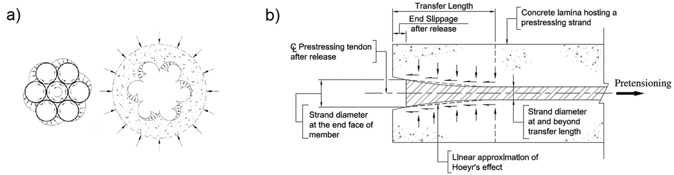 Interaction of pre-tensioned reinforcement and concrete: a) spiral reinforcement pushing into concrete; b) Hoyer effect