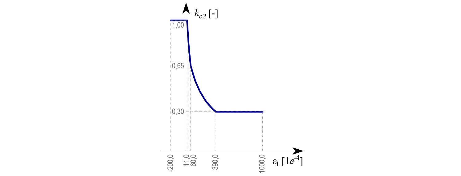 There is also a reduction of the kc2 factor because of the stability of the calculation. This reduction doesn't influence the total strength of members. Assuming fcd value as the factored strength of concrete (design value), the kc2 value is reduced according to the following rules.