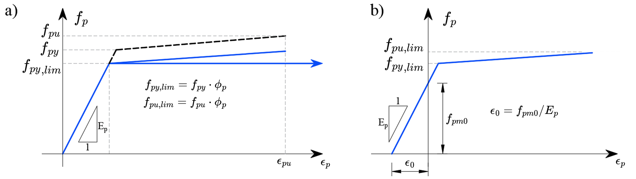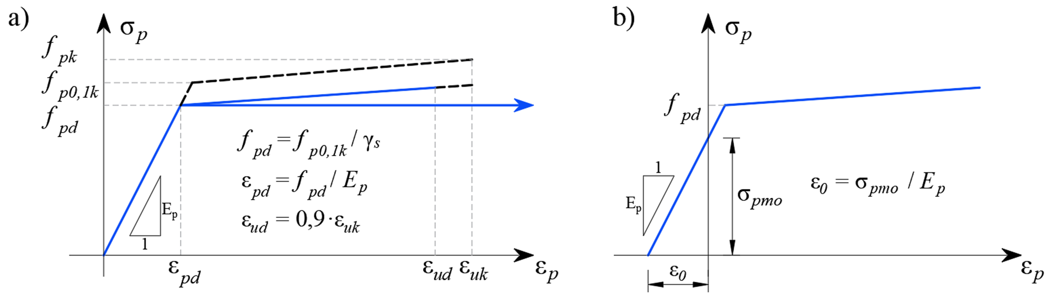 Since the prestressing force is known, and therefore also the prestressing stress σpmo, the material diagram of the reinforcement is used for the stress dependence on the deformation and can be written as: