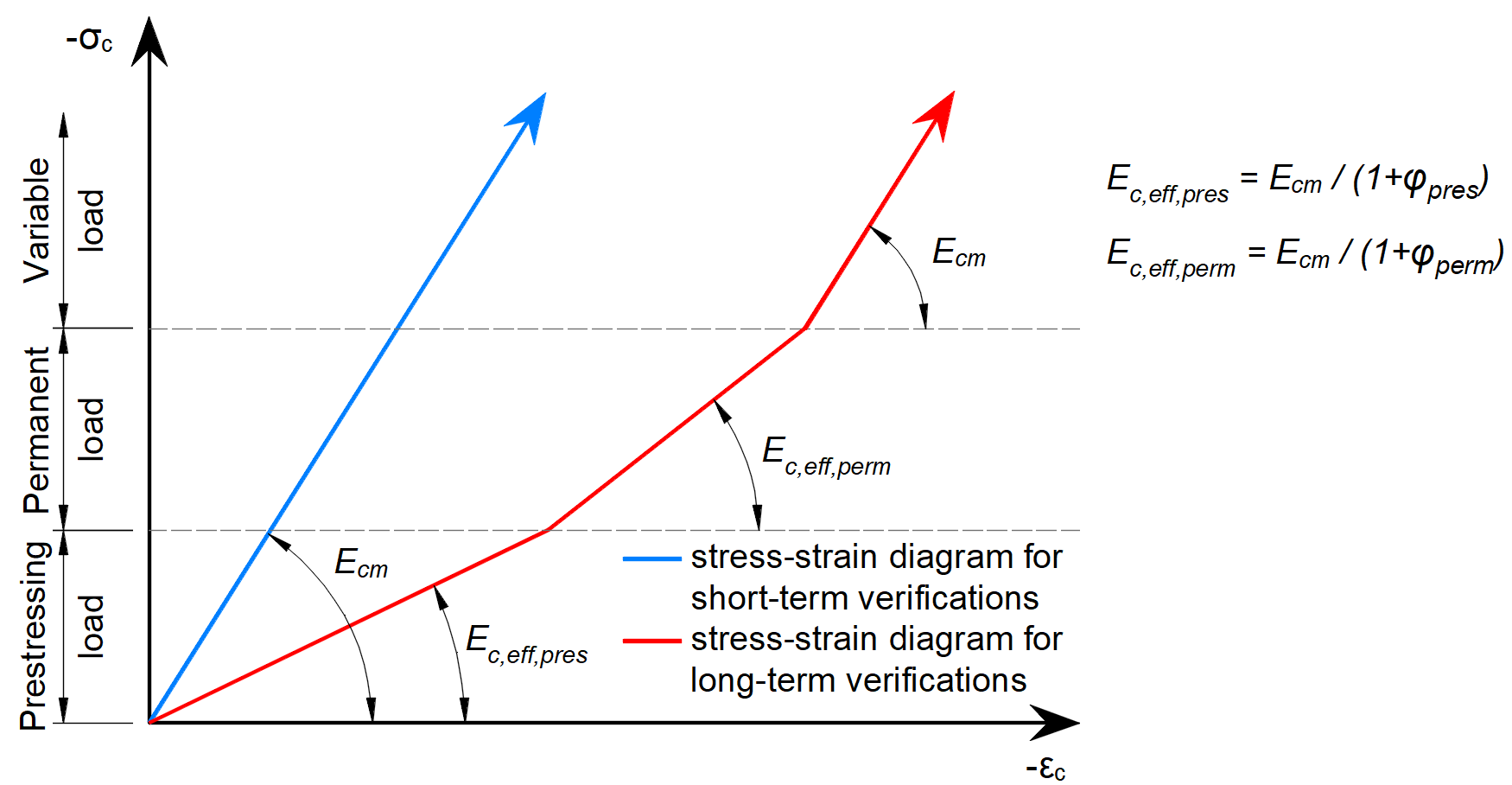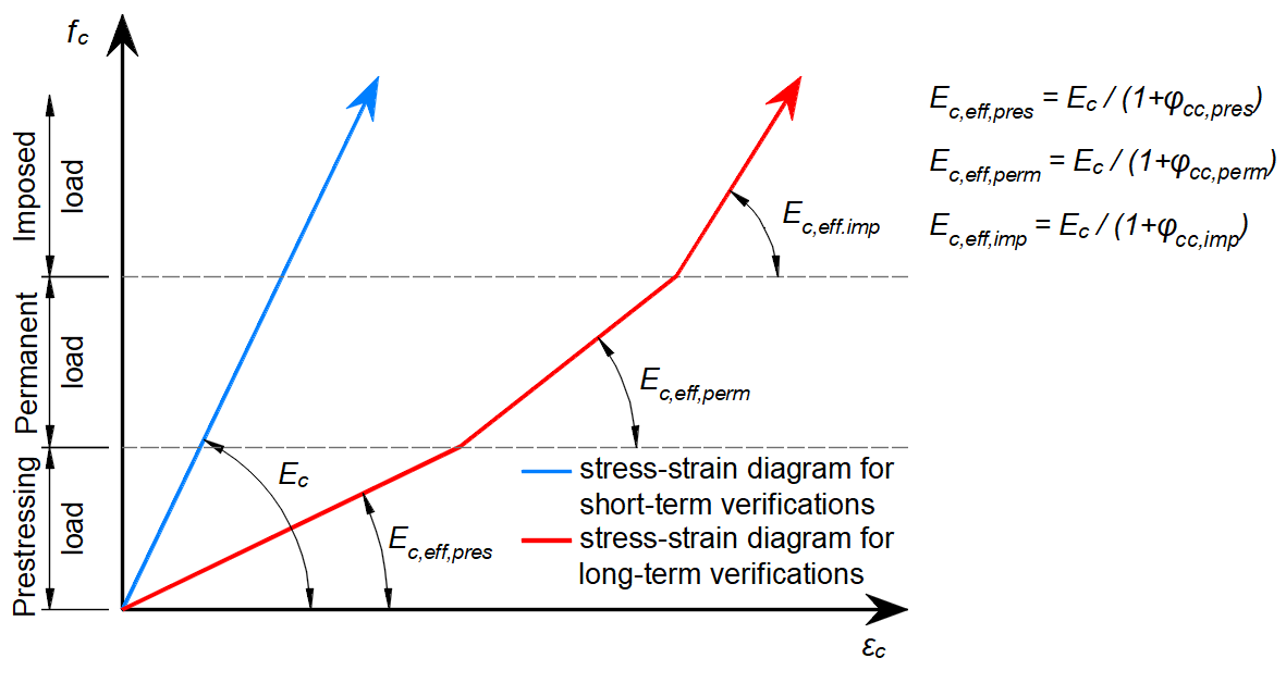 The pre-tensioned reinforcement is prestressed before the casting of the element, the prestressing reinforcement is almost always routed as a straight line, therefore no frictional prestressing losses occur. Once the required concrete strength is reached, the reinforcement is released from the anchor blocks, thus activating the prestressed reinforcement and transferring the forces from the reinforcement to the concrete. This effect is physically equivalent to the subcooling of the reinforcement and is modelled by an initial strain similar to that of thermal loading. This gives a stress-strain diagram of prestressed reinforcement as shown in the figure above in b). The computational model automatically calculates the deformation response of the structure to the applied prestress, and therefore directly determines the prestress losses by elastic strain of the element.