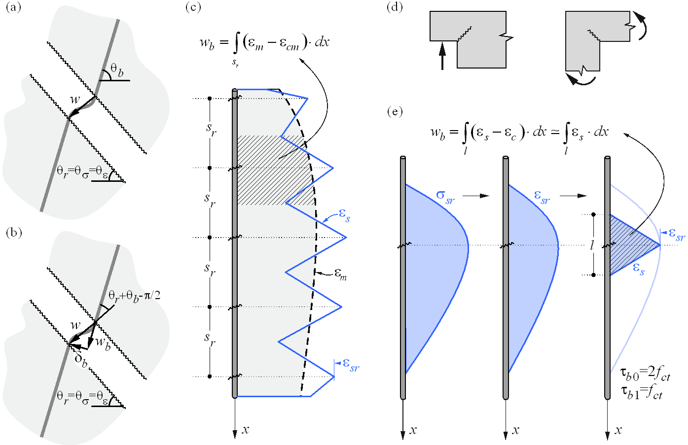 CSFM considers maximum principal concrete stress in compression (σc2r) and reinforcement stresses (σsr) at the cracks while neglecting the concrete tensile strength (σc1r = 0), except for its stiffening effect on the reinforcement. The consideration of tension stiffening allows the average reinforcement strains (εm) to be simulated. Fictitious, rotating, stress-free cracks that open without slip (Fig. 2a) are considered and the equilibrium at the cracks together with the average strains of the reinforcement is also taken into account.