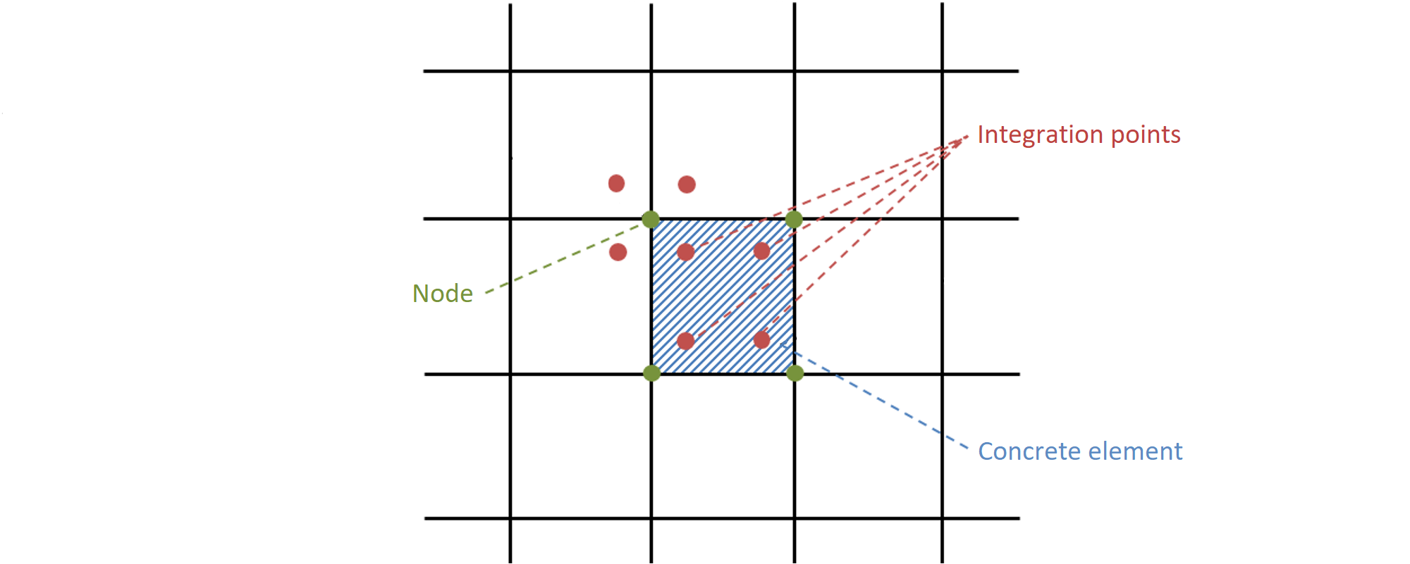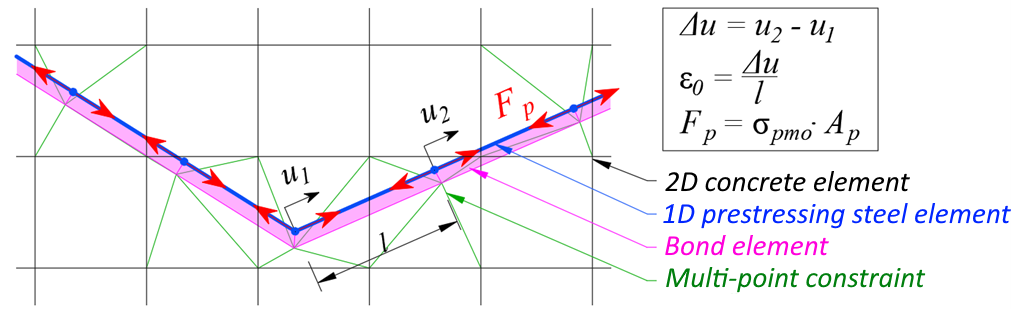 Finite-element concrete mesh with attached 1D prestressing reinforcement elements: