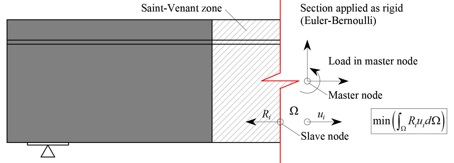 Both entire walls and beams, as well as details (parts) of beams (isolated discontinuity region, also called trimmed end), can be modeled. In the case of walls and entire beams, supports must be defined in such a way that an (externally) isostatic (statically determinate) or hyperstatic (statically indeterminate) structure results. The load transfer at the trimmed ends of beams is introduced by means of a special Saint-Venant transfer zone, which ensures a realistic stress distribution in the analyzed detail region.