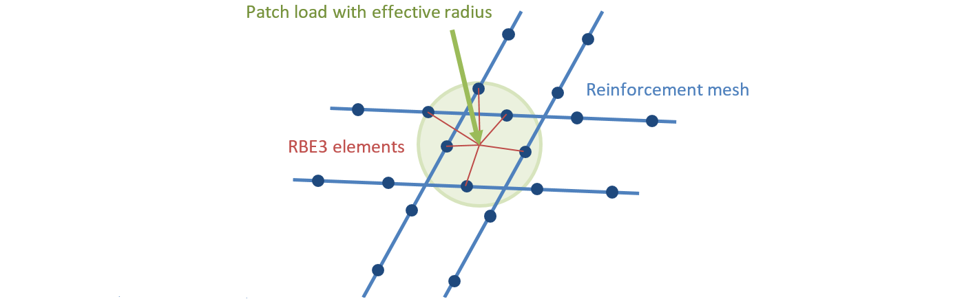 The point load can be applied either directly to the surface of the structure with a defined radius of action (load is applied to the concrete elements) or via a special transmitting device called patch load (Fig. 8b and Fig. 9). Patch load allows transmitting the load directly to the defined reinforcement located within the area of the effective radius. To secure the correct functionality of the patch load, a group of rebars that will be interconnected with the load is necessary to define (in the reinforcement properties). When the interconnected reinforcement is not defined, the load transfer mechanism is the same as for the point load placed on a member surface, and the load is transferred by the constraints to the concrete elements, not directly to the reinforcement.