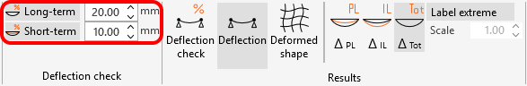 In the application, it is possible to display the deflections from permanent load ΔPL and imposed load ΔIL separately as well as the total deflection ΔTot (permanent + imposed), all while displaying the deformed shape.