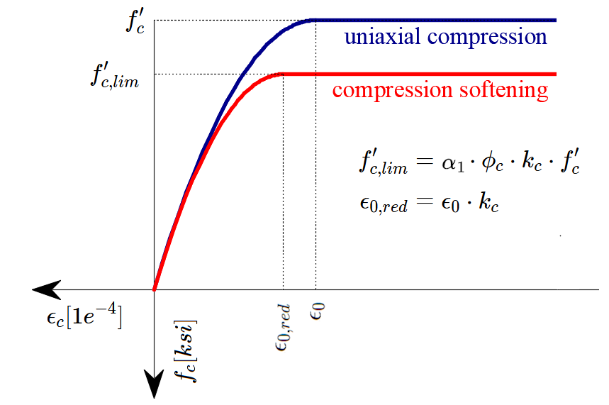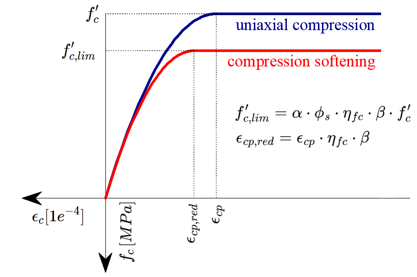 The CSFM in IDEA StatiCa Detail does not consider an explicit failure criterion in terms of strains for concrete in compression (i.e., it considers an infinitely plastic branch after the peak stress is reached). This simplification does not allow the deformation capacity of structures failing in compression to be verified. However, their ultimate capacity is properly predicted when, in addition to the factor of cracked concrete (kc2) defined in (Fig. 2e), the increase in the brittleness of concrete as its strength rises is considered by means of the \( \eta_{fc} \) reduction factor defined in fib Model Code 2010 as follows: