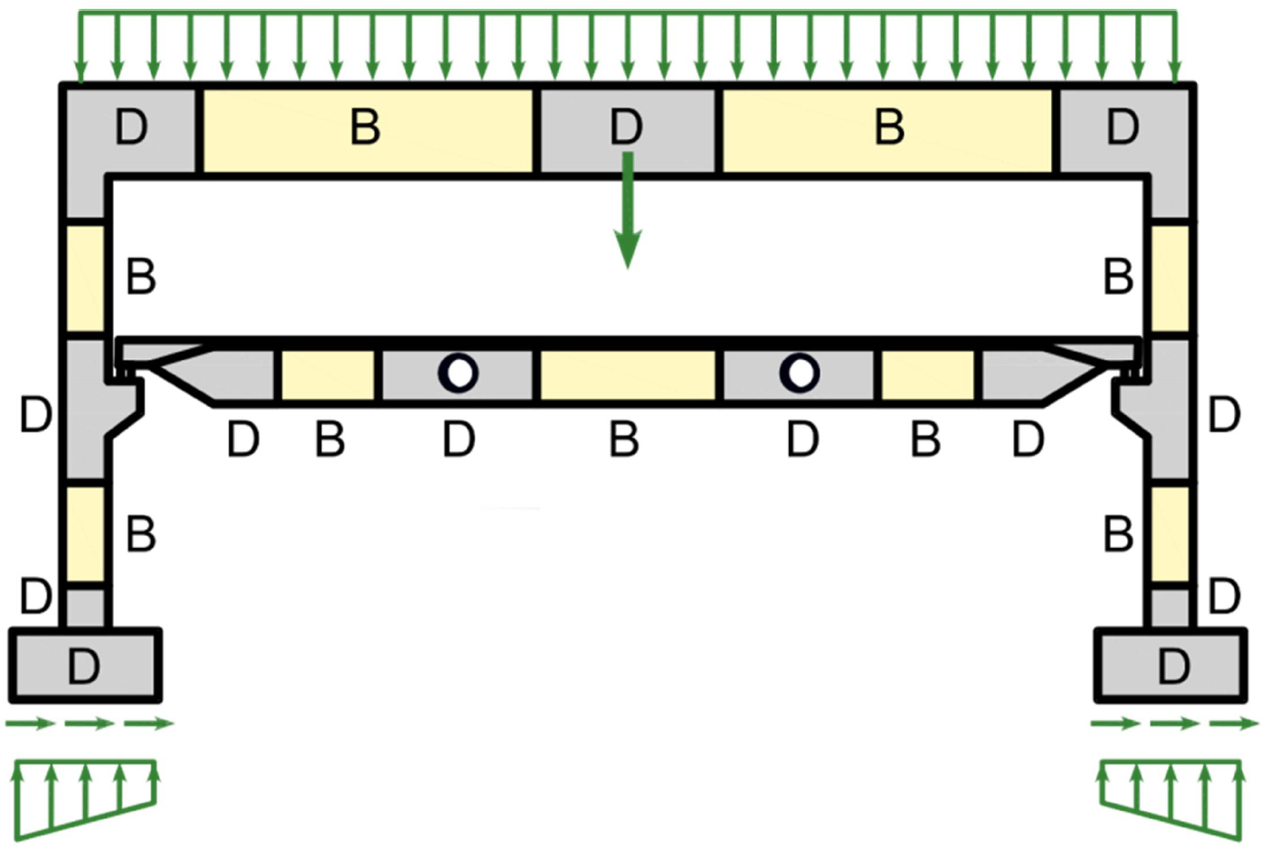 The design and assessment of concrete elements are normally performed at the sectional (1D-element) or point (2D-element) level. This procedure is described in all standards for structural design, e.g., in (EN 1992-1-1 or ACI 318-19), and it is used in everyday structural engineering practice. However, it is not always known or respected that the procedure is only acceptable in areas where the Bernoulli-Navier hypothesis of plane strain distribution applies (referred to as B-regions). The places where this hypothesis does not apply are called discontinuity or disturbed regions (D-Regions). Examples of B and D regions of 1D-elements are given in (Fig. 1). These are, e.g., bearing areas, parts where concentrated loads are applied, locations where an abrupt change in the cross-section occurs, openings, etc. When designing concrete structures, we meet a lot of other D-Regions such as walls, bridge diaphragms, corbels, etc.