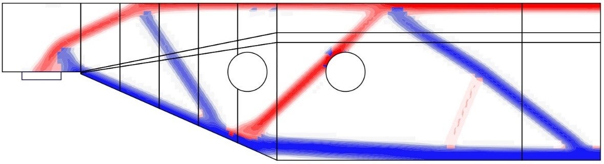 The iterative optimization process starts with a homogeneous density distribution. The calculation is performed for multiple total volume fractions (20%, 40%, 60%, and 80%), which allows the user to select the most practical result. The resulting shape consists of trusses with struts and ties and represents the optimum shape for the given load cases (Fig. 5).