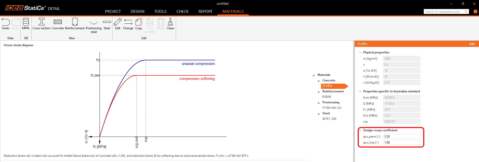 Values of stress reduction factors are prescribed in AUS 3600 Cl. 2.2.3. The default values for concrete and reinforcement are set according to Table 2.2.3