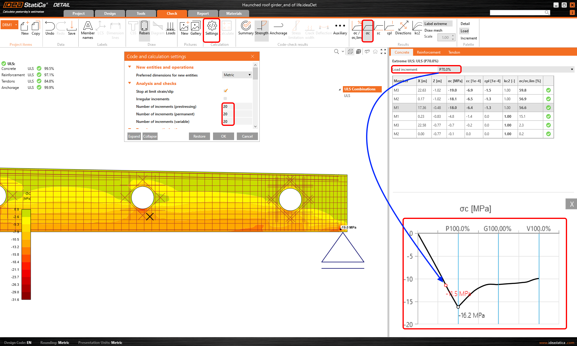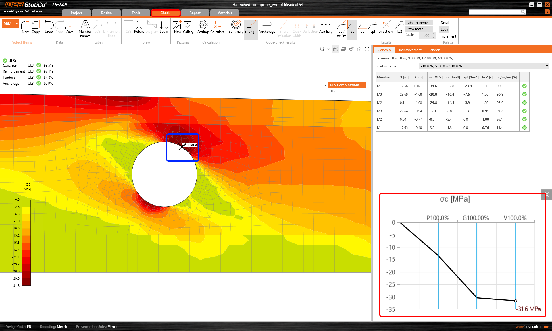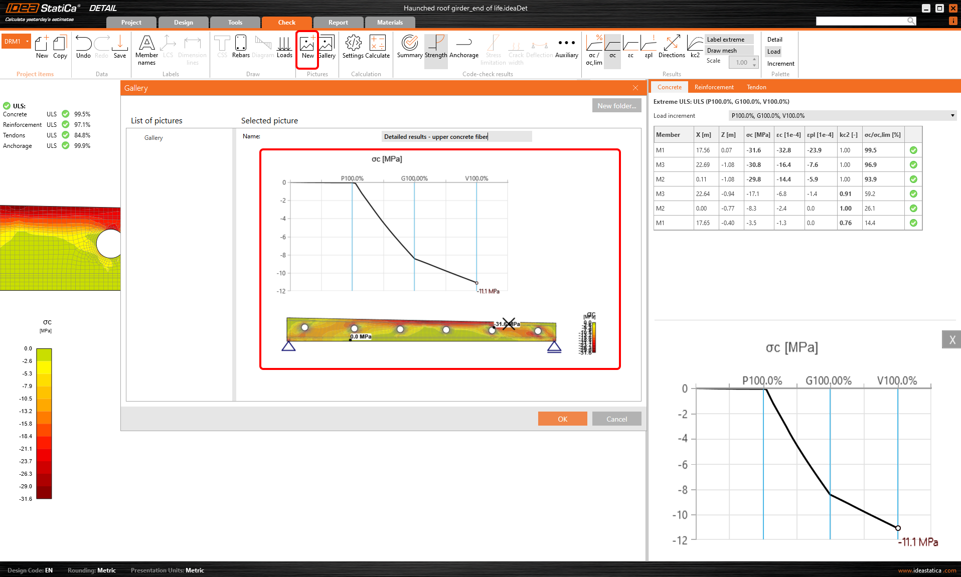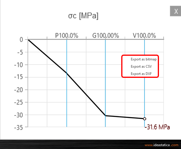 And there is more! Use the right-click button and observe another advanced functionality - result interpretation in a Chart. After clicking on a part of a structure (Shift+ left-click button or running the context menu by right-click button), the load-deformation curve or curve presents the development of the observed variable (stress, strain, crack width, etc.) is drawn in the upper-left corner of the main scene. The curve presents all load increments that were applied in CSFM analysis for the current load case or combination. The value of the load increment selected in the ribbon of Results is highlighted in the chart by the red color. The horizontal axis represents the applied load increment (P = 100% of applied prestressing, G = applied 100% of permanent load, V = applied 100% of variable load). The vertical axis represents the observed CSFM results, such as stresses, strains, deformation, crack width, anchorage forces, and others. The data from the chart can be exported to a bitmap, CSV, or DXF file using the context menu of the chart (right-click button).