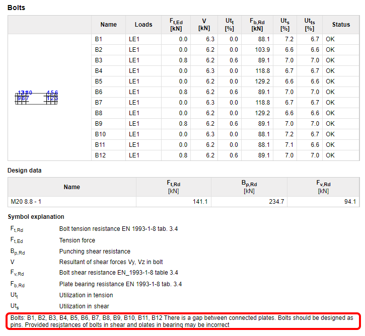 For bolts with such a gap whose type is Bearing - tension/shear - there is a note in the report stating the results may not be accurate.