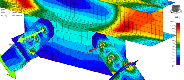 The visual check of the bolts will be even easier with this useful feature. The tensile force in each bolt is now represented with an arrow in different colors. These colors comply with the well-known “traffic light” principle (grey, green, orange, and red). The size of the arrow corresponds to the tensile force magnitude.
