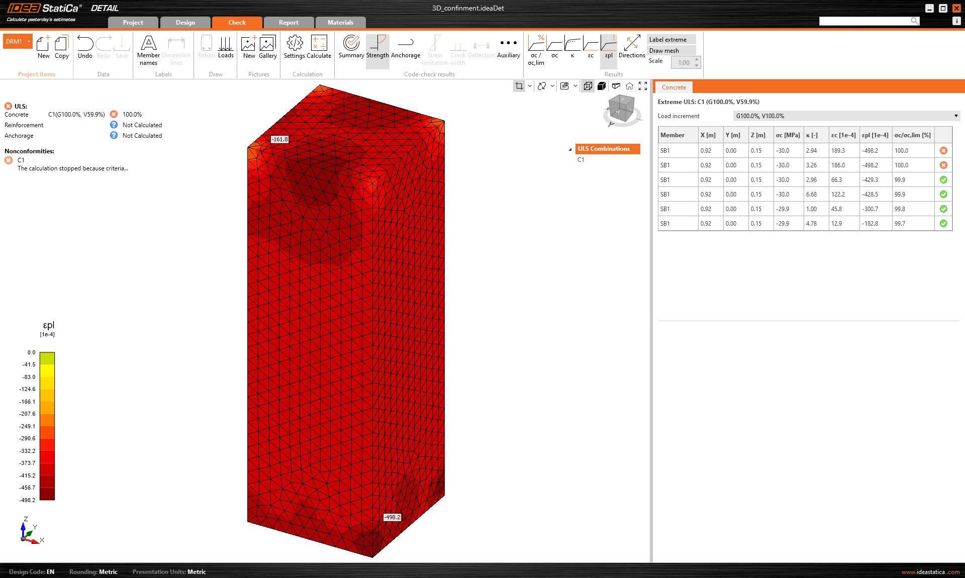 Let us now look at the results. As expected, the calculation was stopped because the plastic strain criteria in the concrete, which is 5%, were exceeded.