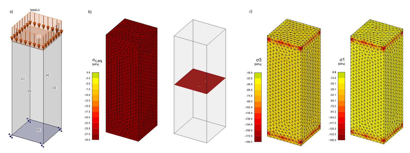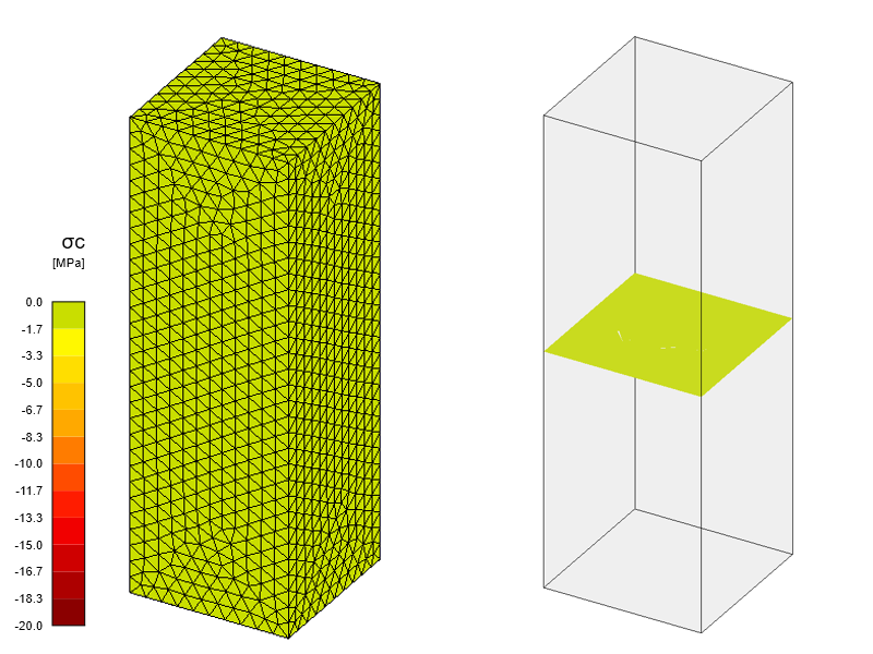 The model is of the solid block type with plan dimensions 1.0 x 1.0 m and a height of 3.0 m made of C30/37 concrete supported by a rigid surface support in the Z direction. Only for the sake of the stability of the analysis model, the X and Y directions are also included on the surface support with a neglectable stiffness value. The load is applied in two steps. In the first step, a hydrostatic pressure (σc,1 = σc,2 = σc,3) of 20 MPa is applied to the model. This high value, relative to the concrete strength, was chosen mainly to demonstrate the stability of the computational model.