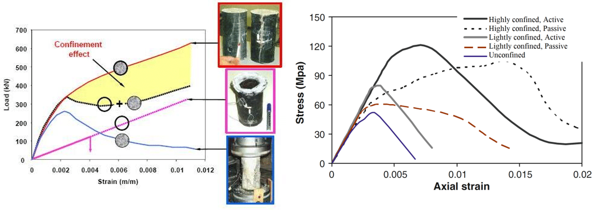 In the following figure, you can notice how the stress-strain diagram and bearing capacity can differ for unconfined and confined concrete.