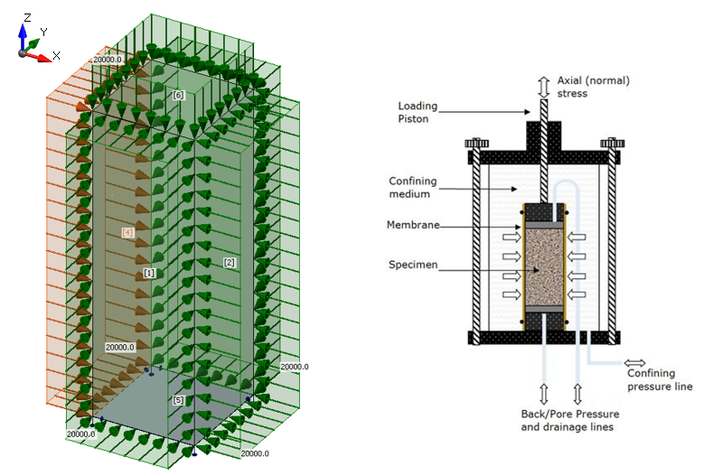 \[ \textsf{\textit{\footnotesize{Fig. 4\qquad Triaxial test setup - model, load, and boundary conditions}}}\]