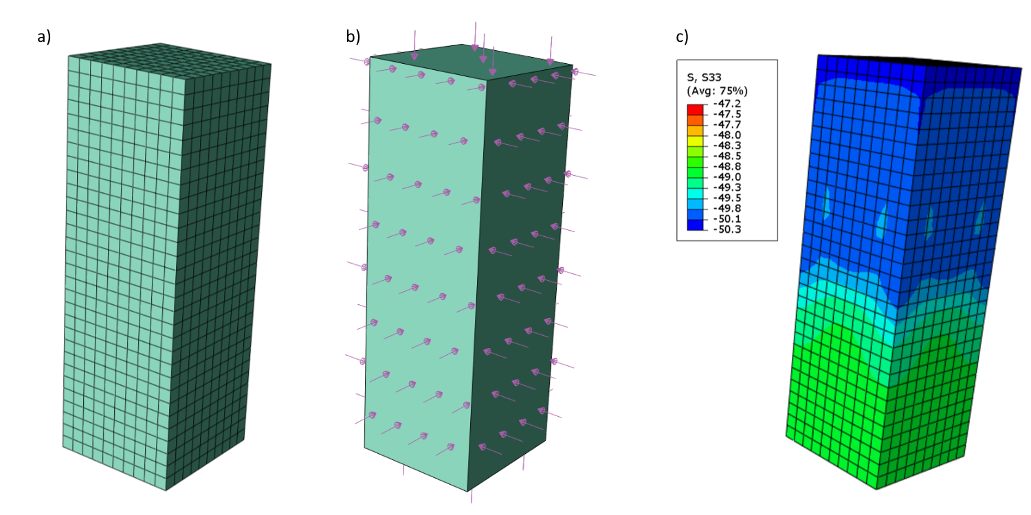\[ \textsf{\textit{\footnotesize{Fig. 7\qquad ABAQUS model: a) Concrete mesh 2; b) Load definition; c) Principal stresses σc,3}}}\]
