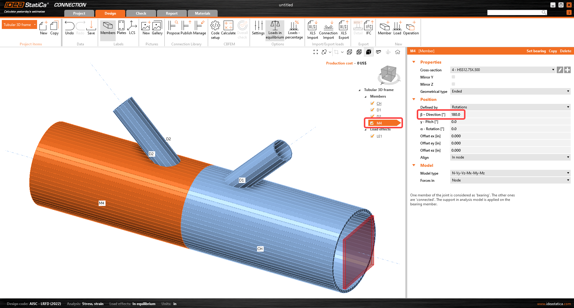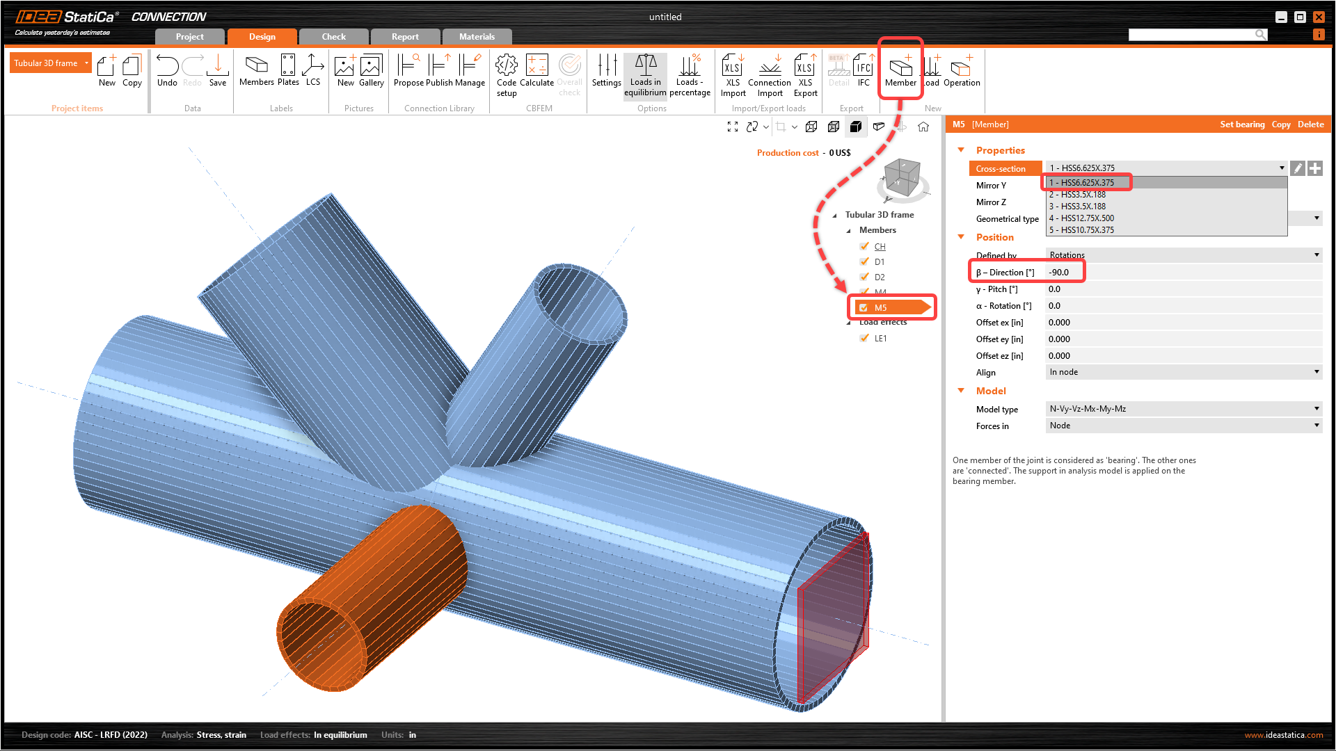 Now you have to add another member, click the Member option at the top ribbon. Change the direction and cross-section for the new member as shown in the image below.