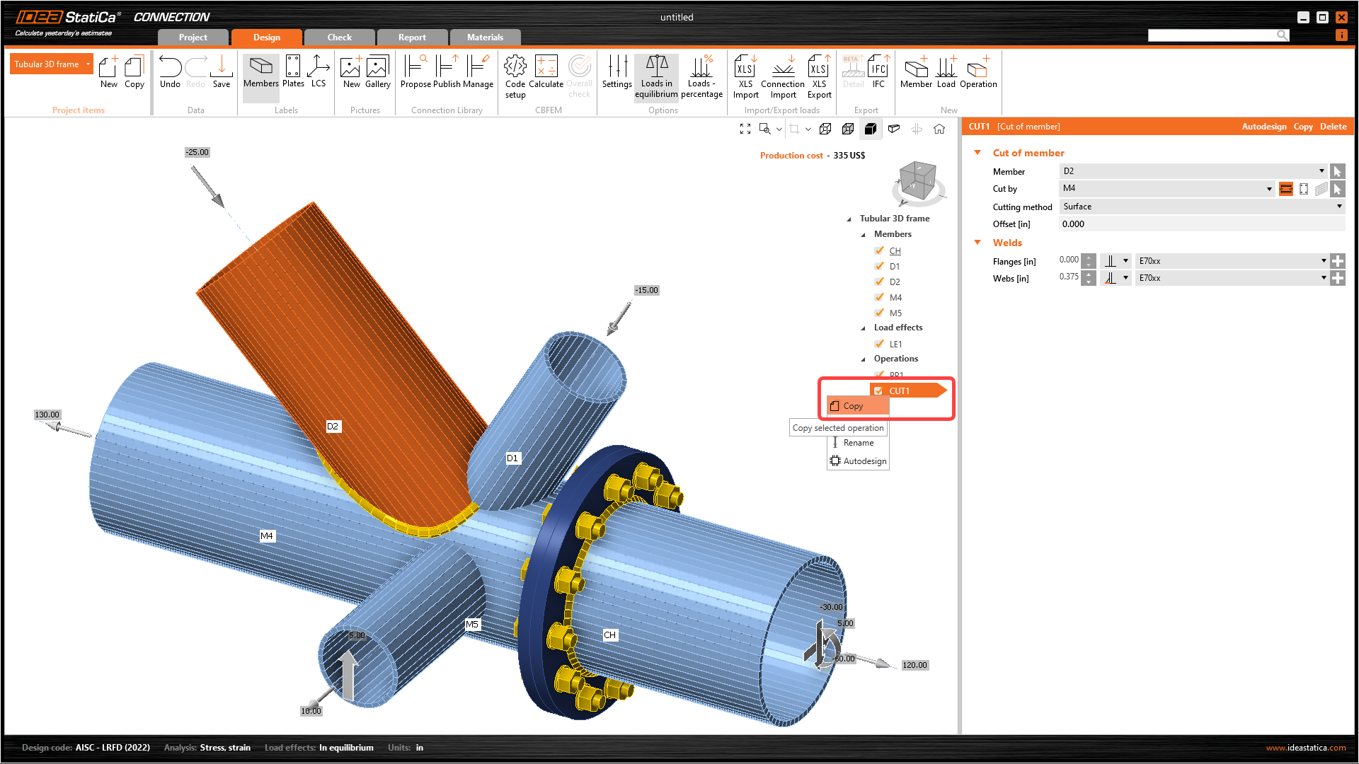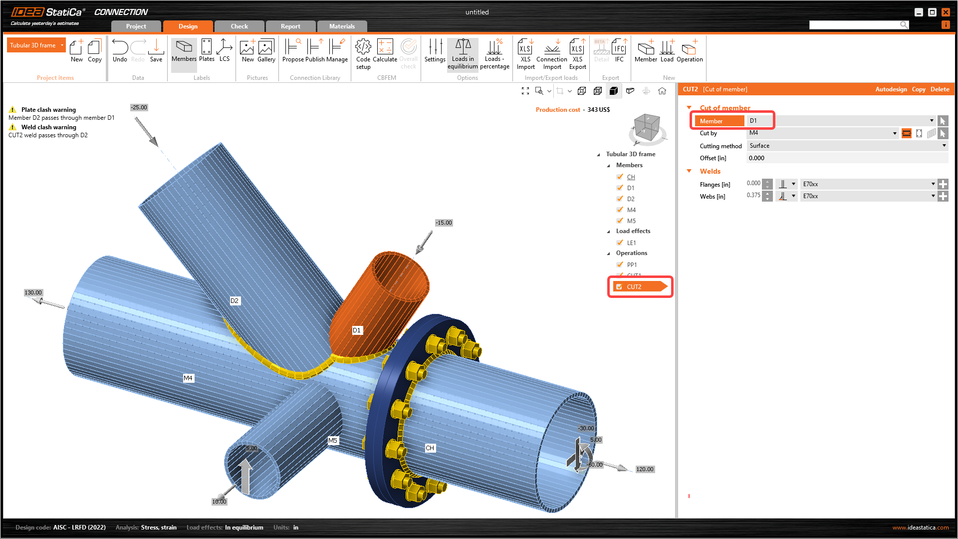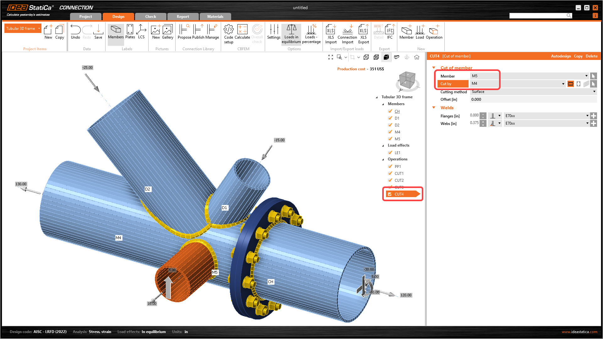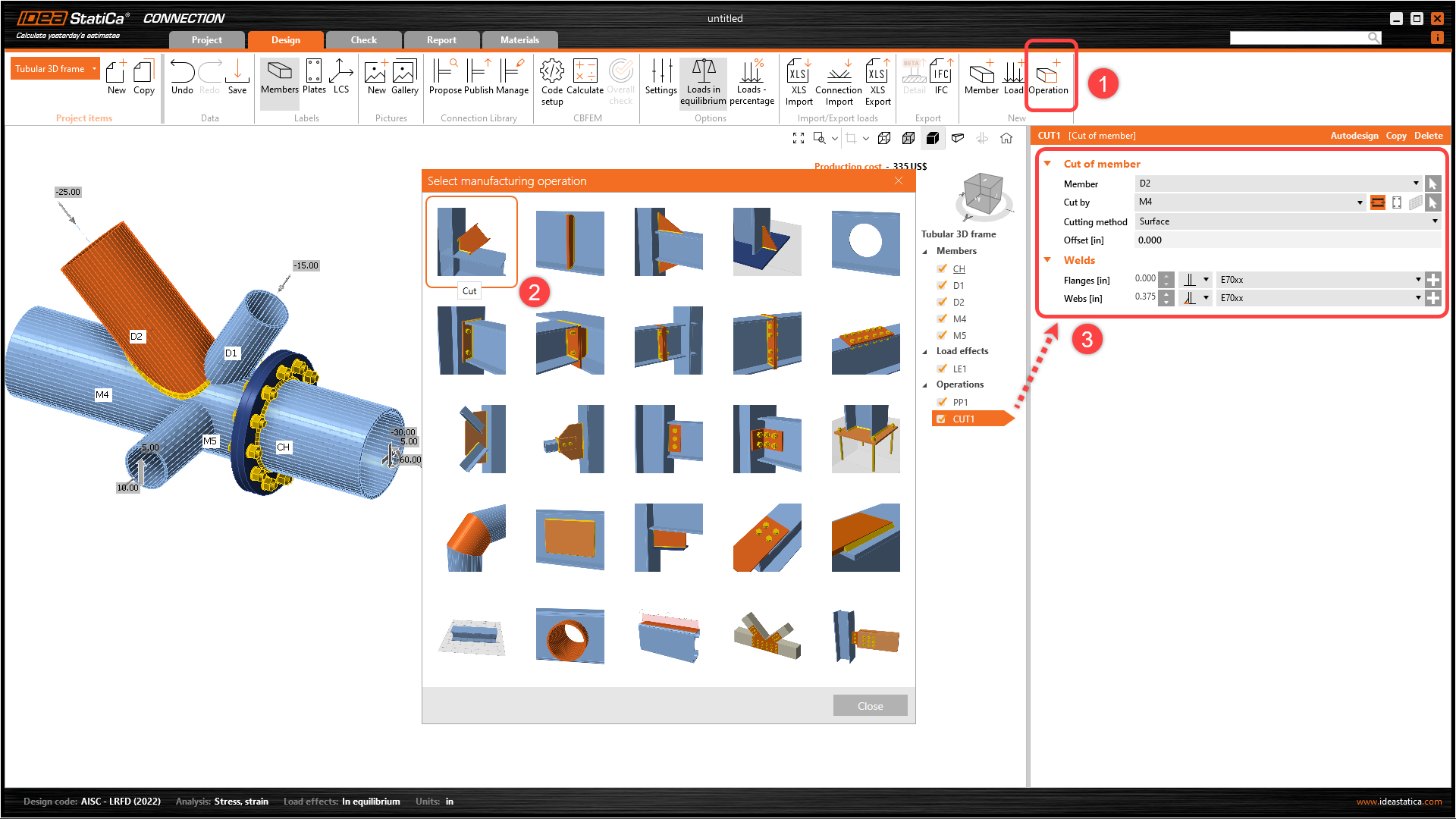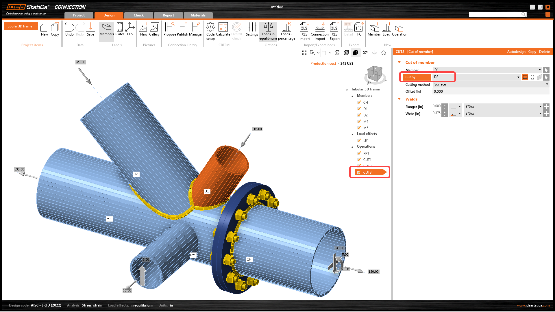 Now, connect the other members by the Cut manufacturing operations. Add a new operation through the Operation feature at the top ribbon to cut member D2. Change the properties of the operation CUT1 following the image below.