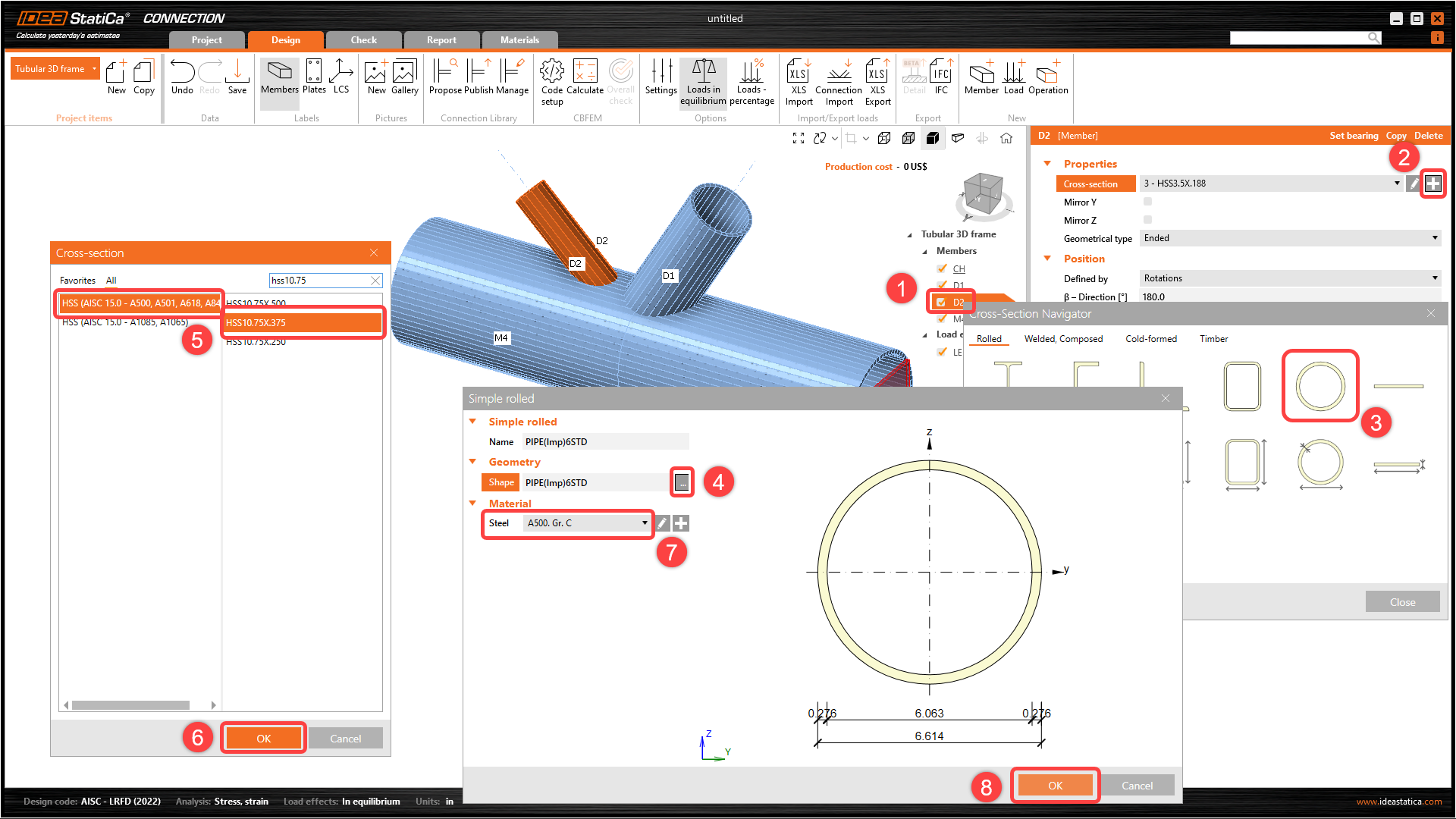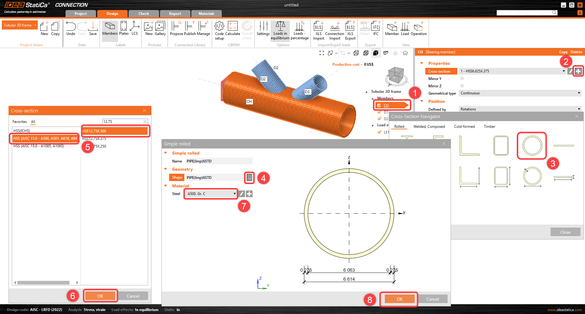 Start with a modification of the joint geometry. Select member CH and click the "+" icon to open the Cross-Section Navigator. Choose the Circular hollow section profile and select HSS12.75X.500 cross-section along with the corresponding library.