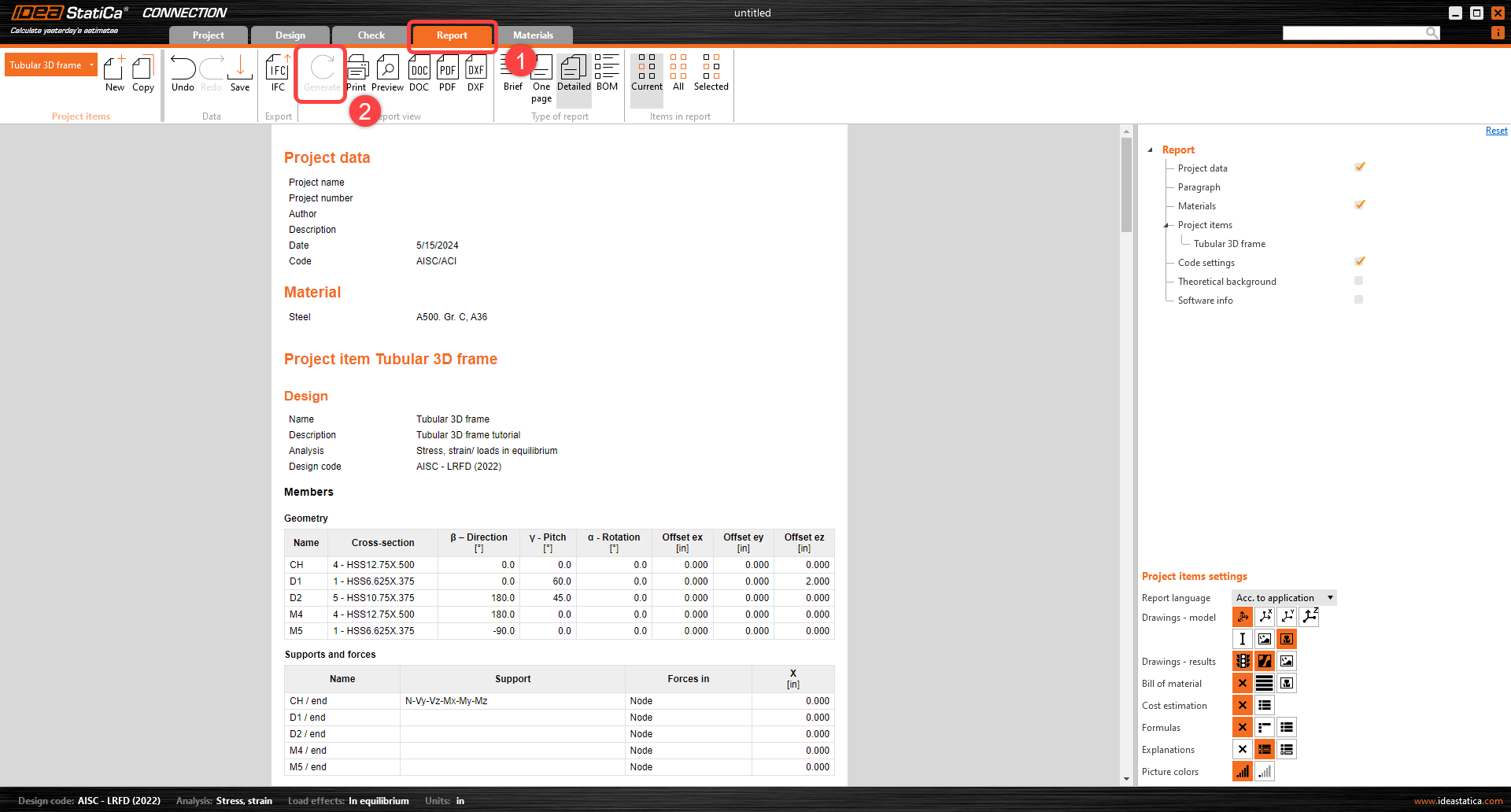 At last, go to the tab Report. IDEA StatiCa offers a fully customizable report to print out or save in an editable format.