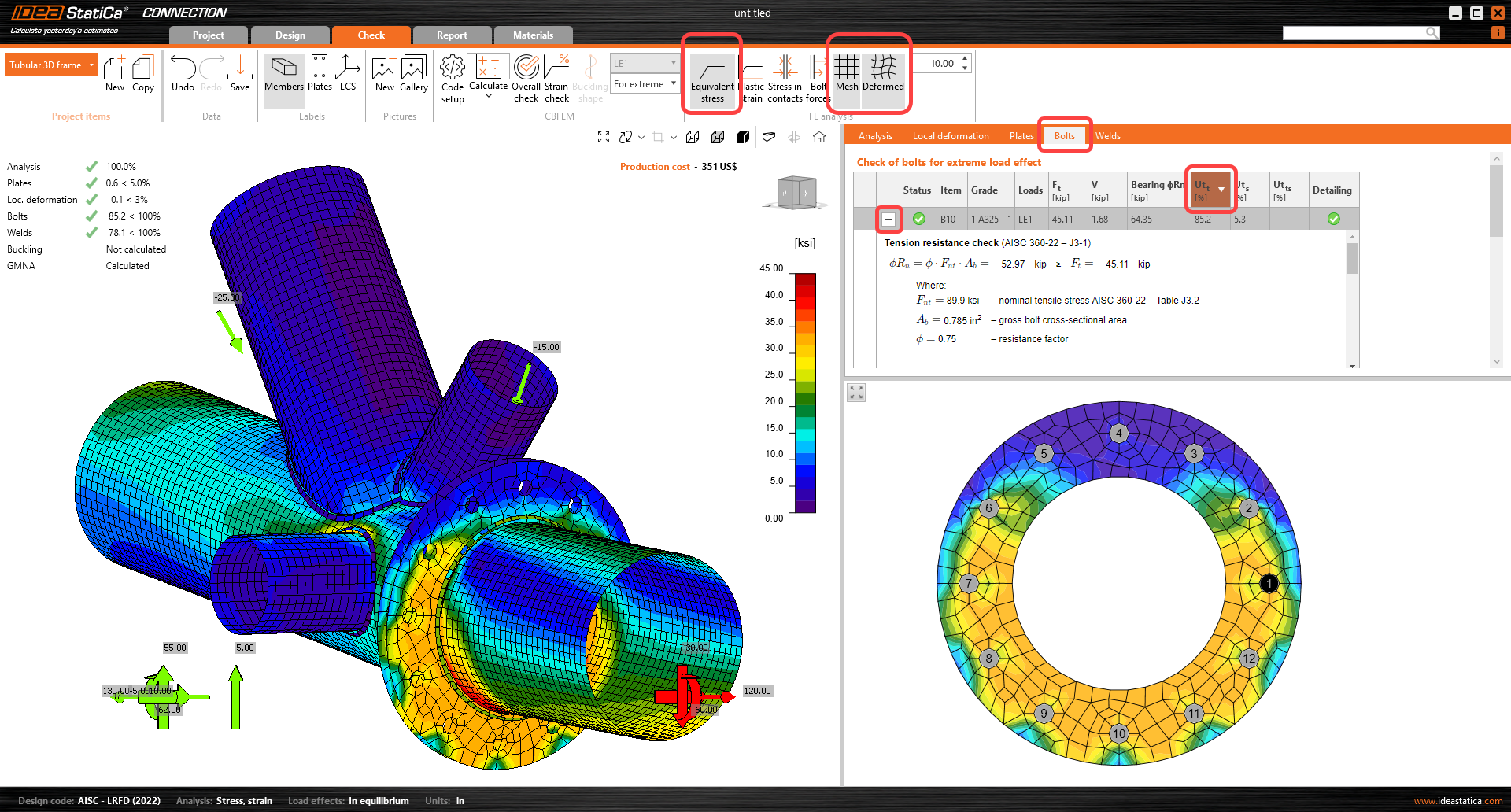 You will choose the Check tab and turn on the Equivalent stress, Mesh, and Deformed model view. You can explore the detailed results for the Bolts also, let’s expand the results for the bolt B7.