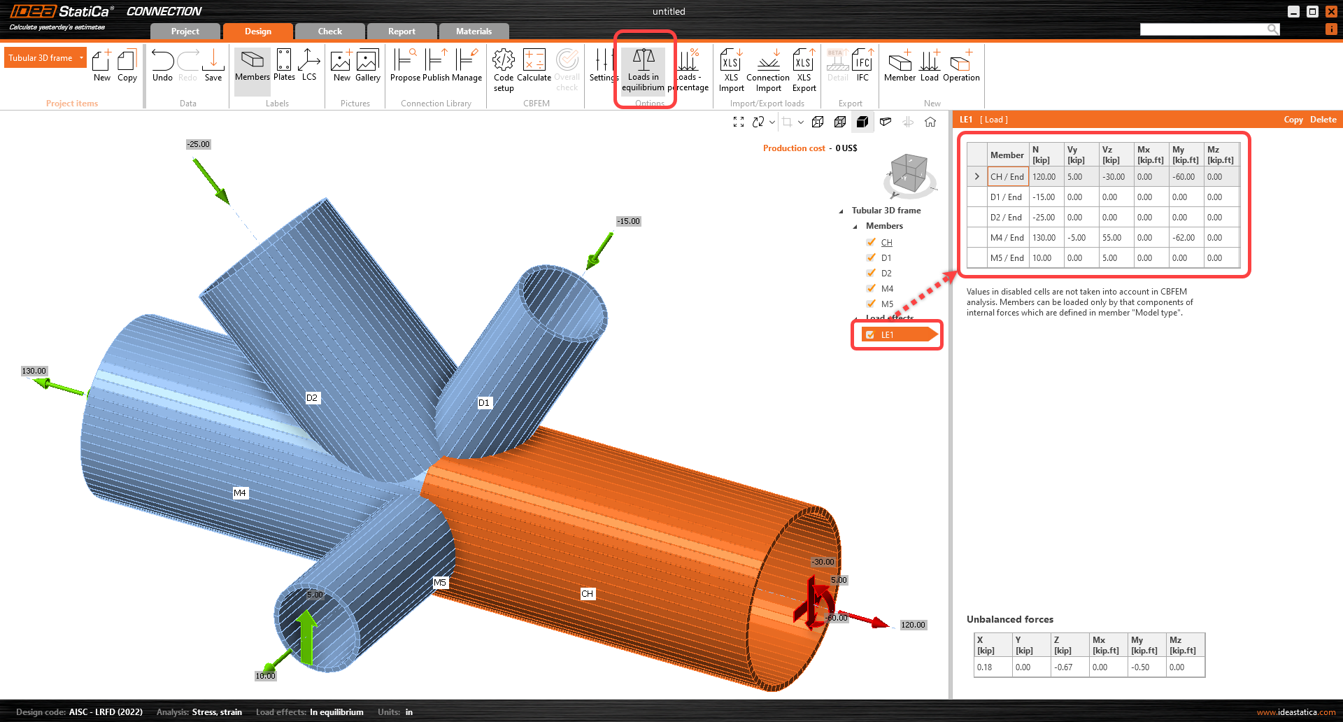 You can continue with the Load effects. One load effect was automatically added by the wizard. You will input all internal forces into the table. You should not forget to turn on the Loads in equilibrium command in the top ribbon.